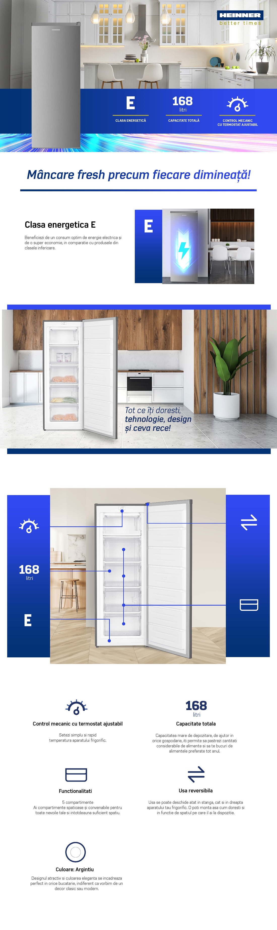 Congelator Heinner HFF-HM168SE++, clasa energetica: E, capacitate totala: 168L, control mecanic cu termostat reglabil, 5 compartimente congelator, dezghetare manuala, usa reversibila, capacitate congelare: 7.8 kg/24h, dimensiuni: 54.4 x 57.1 x 142.6 cm, culoare: Argintiu