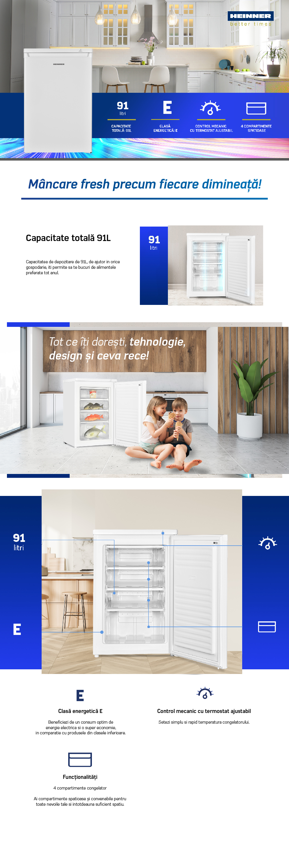 Congelator Heinner HFF-HM91E++, clasa energetica: E, capacitate totala: 91L, control mecanic cu termostat ajustabil, 4 compartimente, dezghetare manuala, usa reversibila, capacitate congelare: 4.4 kg/24h, dimensiuni: 55 x 58 x 85 cm, culoare: Alb