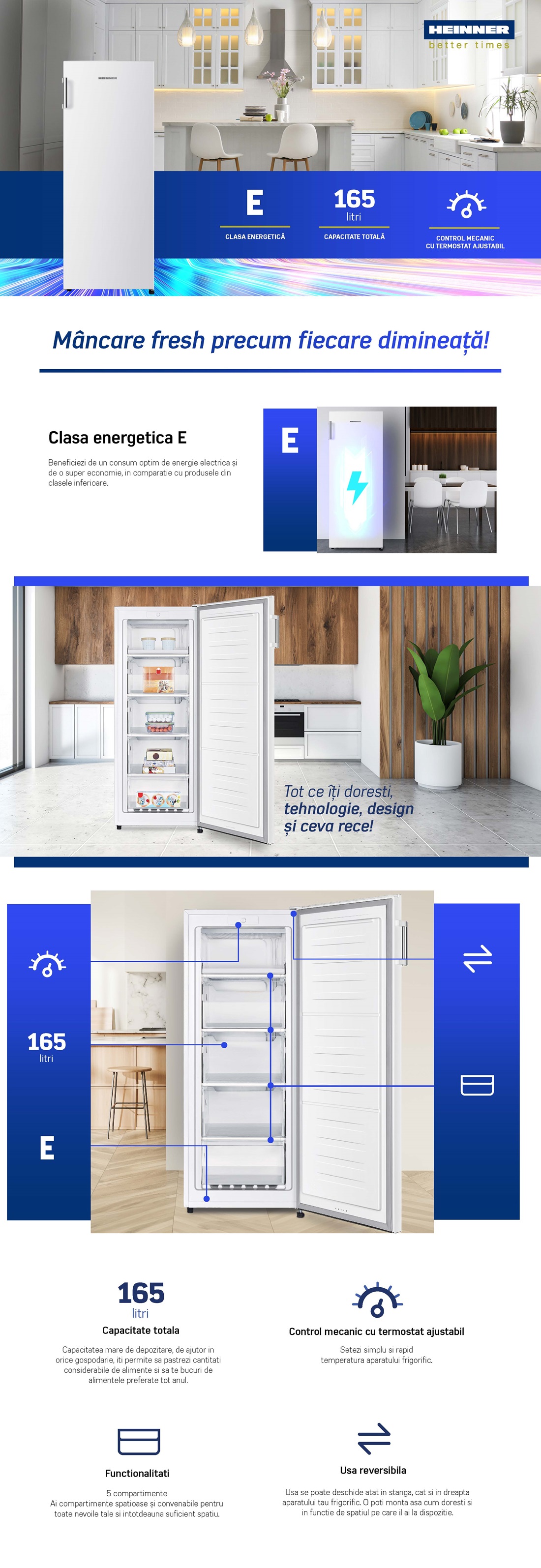 Congelator Heinner HFF-HS165E++, clasa energetica: E, capacitate totala: 165 L, control mecanic cu termostat ajustabil, 5 compartimente congelator, usa reversibila, capacitate congelare: 7.6kg/24h, dimensiuni (WxDxH): 55 × 58.8 × 143.4 cm, culoare: Alb