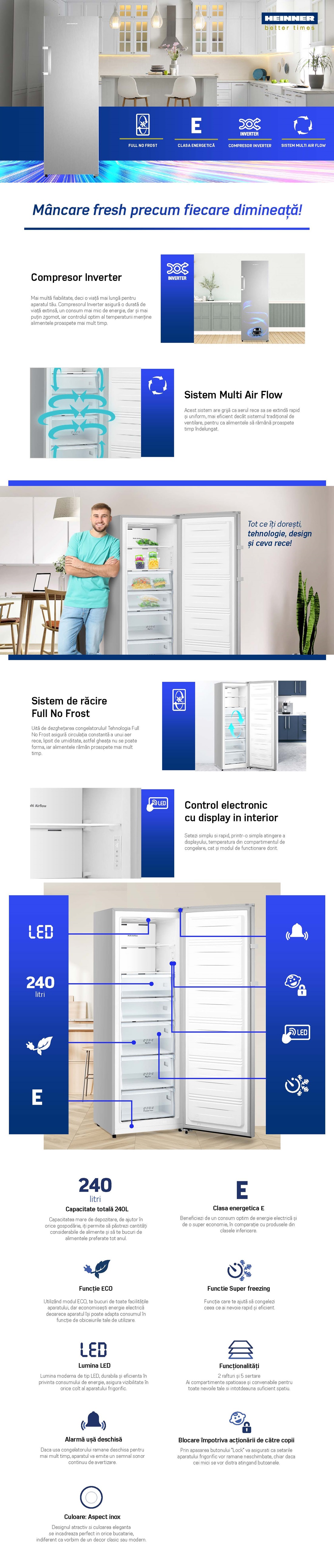 Congelator Heinner HFF-HS240NFXE++, Full No Frost, sistem Multi Air Flow, clasa energetica: E, capacitate totala: 240L, control electronic cu display, functie “Congelare rapida”, functie ECO, 7 compartimente congelator: 5 sertare + 2 compartimente cu rafturi din sticla, lumina LED, alarma usa deschisa, blocare impotriva actionarii de catre copii, usa reversibila, tavita cuburi de gheata, capacitate de congelare: 10.8 kg/24h, dimensiuni (WxDxH): 59.5 x 59 x 172 cm, culoare: Aspect inox