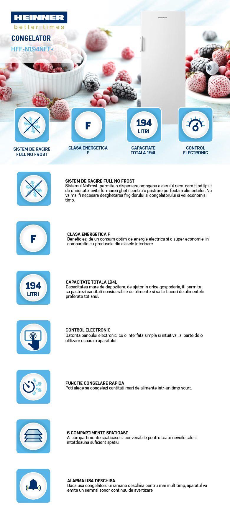Congelator Heinner HFF-N194NFF+, Full No Frost, clasa energetica: F, display LED, capacitate totala: 194L, functie Congelare rapida, alarma usa deschisa, 6 compartimente congelator, usa reversibila, tavita cuburi de gheata, capacitate de congelare: 9kg/24h, dimensiuni (WxDxH): 55.9 × 61.4 × 169.1 cm, culoare: Alb