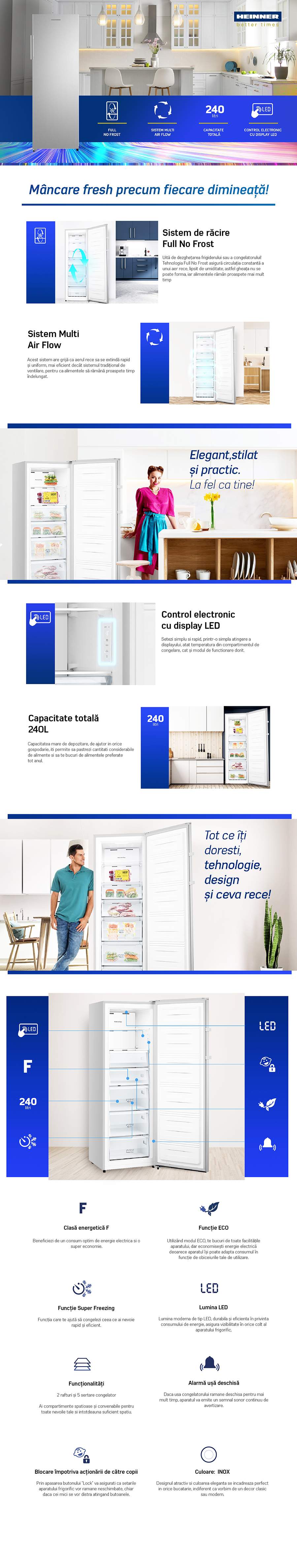 Congelator Heinner HFF-N240NFXF+, Full No Frost, clasa energetica: F, capacitate totala: 240 L, sistem Multi-air flow, display LED in interior, control electronic, functie Congelare rapida, functie ECO, alarma usa deschisa, 7 compartimente congelator: 5 sertare + 2 compartimente cu rafturi din sticla, capacitate de congelare: 10.8kg/24h, dimensiuni (WxDxH): 59.5 x 59 x 172 cm, culoare: Aspect inox