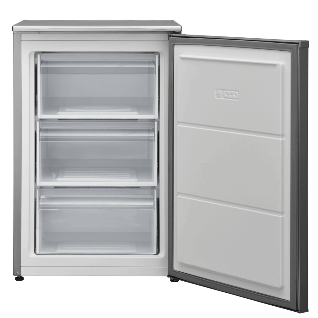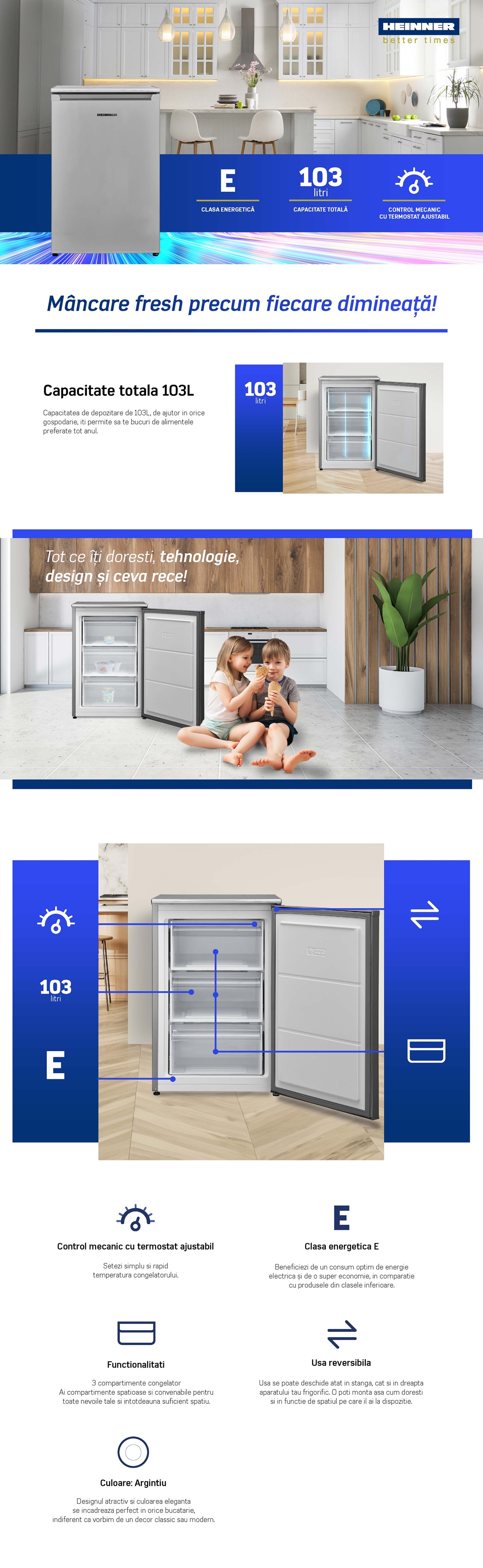 Congelator Heinner HFF-V102SE++, clasa energetica: E, capacitate totala: 103L, control mecanic cu termostat ajustabil, 3 compartimente congelator, usa reversibila, capacitate congelare: 5.2kg/ 24h, dimensiuni (WxDxH): 54 x 61.5 x 83.8 cm, culoare: Argintiu cu decoratiune cromata pe maner