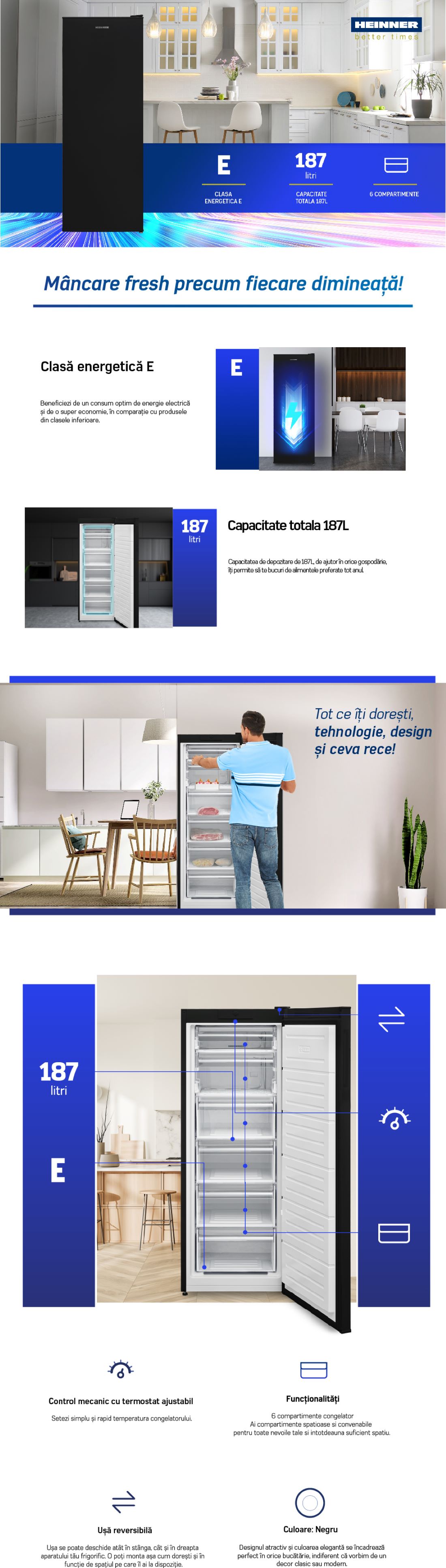 Congelator Heinner HFF-V188BKE++, clasa energetica: E, capacitate totala: 187L, control mecanic cu termostat ajustabil, 6 compartimente congelator, usa reversibila, capacitate congelare: 9.1kg/24h, dimensiuni (WxDxH): 54 x 59.5 x 145.5 cm, culoare: Negru