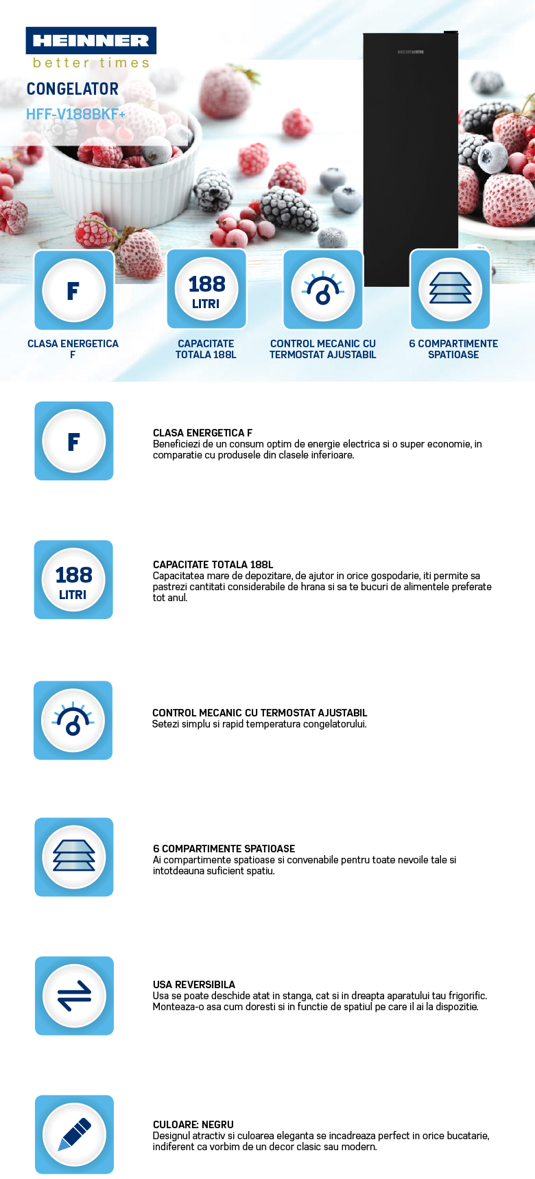 Congelator Heinner HFF-V188BKF+, clasa energetica: F, capacitate totala: 188L, control mecanic cu termostat ajustabil, 6 compartimente congelator, usa reversibila, capacitate congelare: 9.1kg/24h, dimensiuni (WxDxH): 54 x 59.5 x 145.5 cm, culoare: Negru
