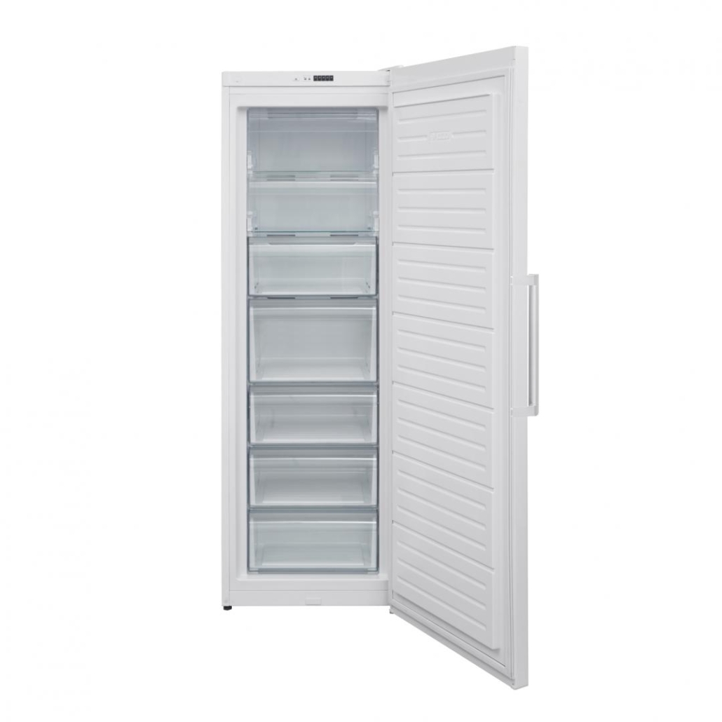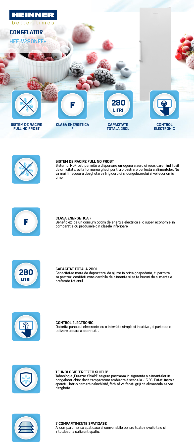 Congelator Heinner HFF-V280NFF+, Full No Frost, clasa energetica: F, capacitate totala: 280L, control electronic, tehnologie "Freezer shield" (opereaza la temperaturi scazute de pana la -15°C), functie "Congelare rapida", 7 compartimente congelator, usa reversibila, tavita cuburi de gheata, capacitate de congelare: 13kg/24h, dimensiuni (WxDxH): 59.5 x 65 x 186 cm, culoare: alb