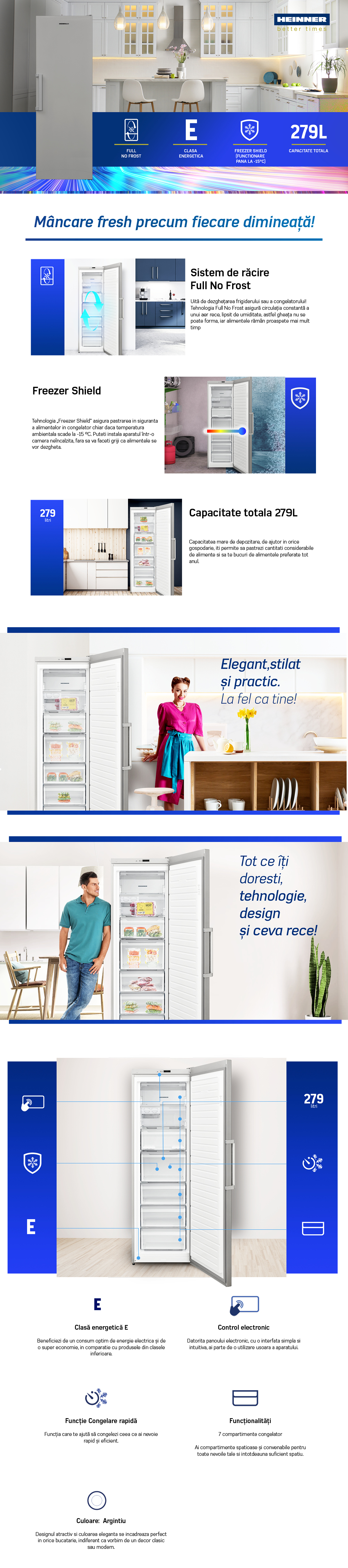 Congelator Heinner HFF-V280NFSE++, Full No Frost, clasa energetica: E, capacitate totala: 280L, display LED, control electronic, tehnologie “Freezer shield” (opereaza la temperaturi scazute de pana la -15°C), recipient cuburi de gheata rotativ, 7 compartimente, alarma usa deschisa, usa reversibila, capacitate de congelare: 13kg/24h, dimensiuni: 59.5 x 65 x 186 cm, culoare: Argintiu