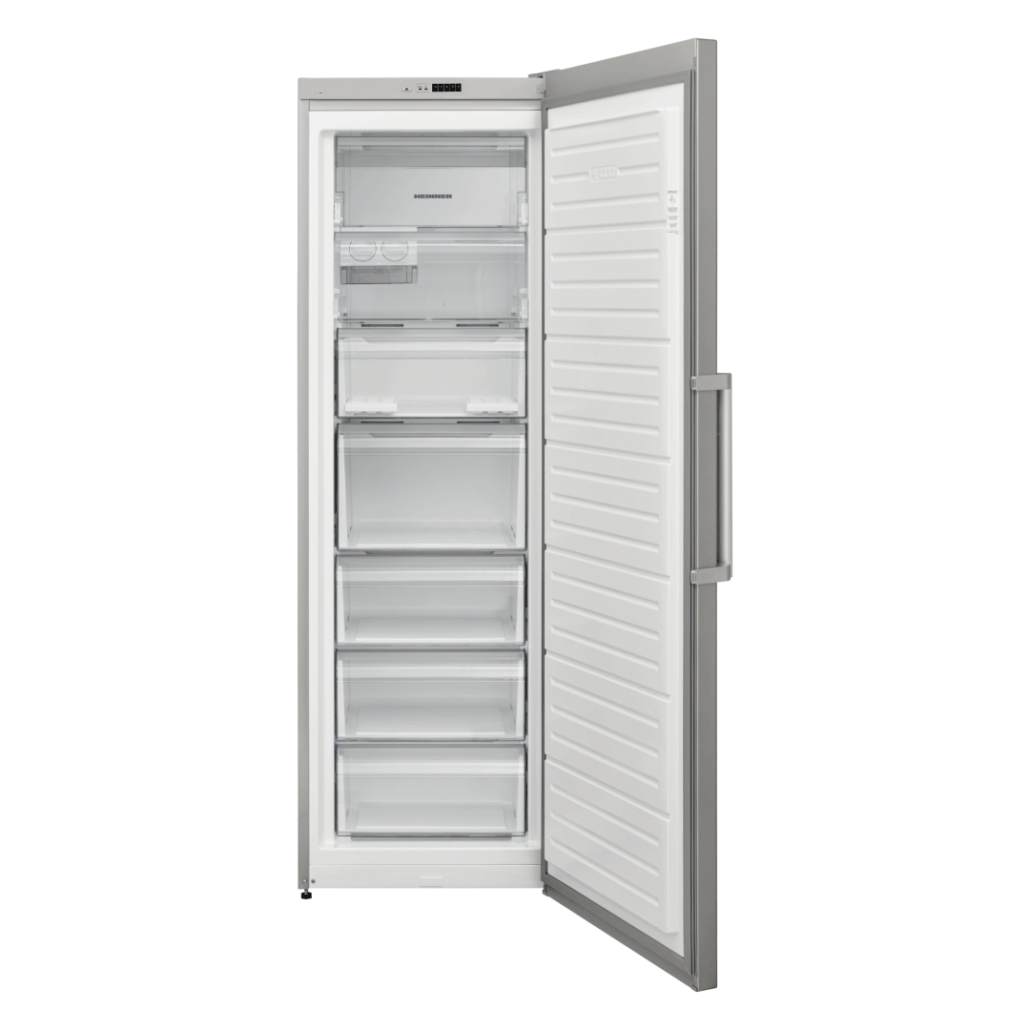 Congelator Heinner HFF-V280NFSE++, Full No Frost, clasa energetica: E, capacitate totala: 280L, display LED, control electronic, tehnologie “Freezer shield” (opereaza la temperaturi scazute de pana la -15°C), recipient cuburi de gheata rotativ, 7 compartimente, alarma usa deschisa, usa reversibila, capacitate de congelare: 13kg/24h, dimensiuni: 59.5 x 65 x 186 cm, culoare: Argintiu