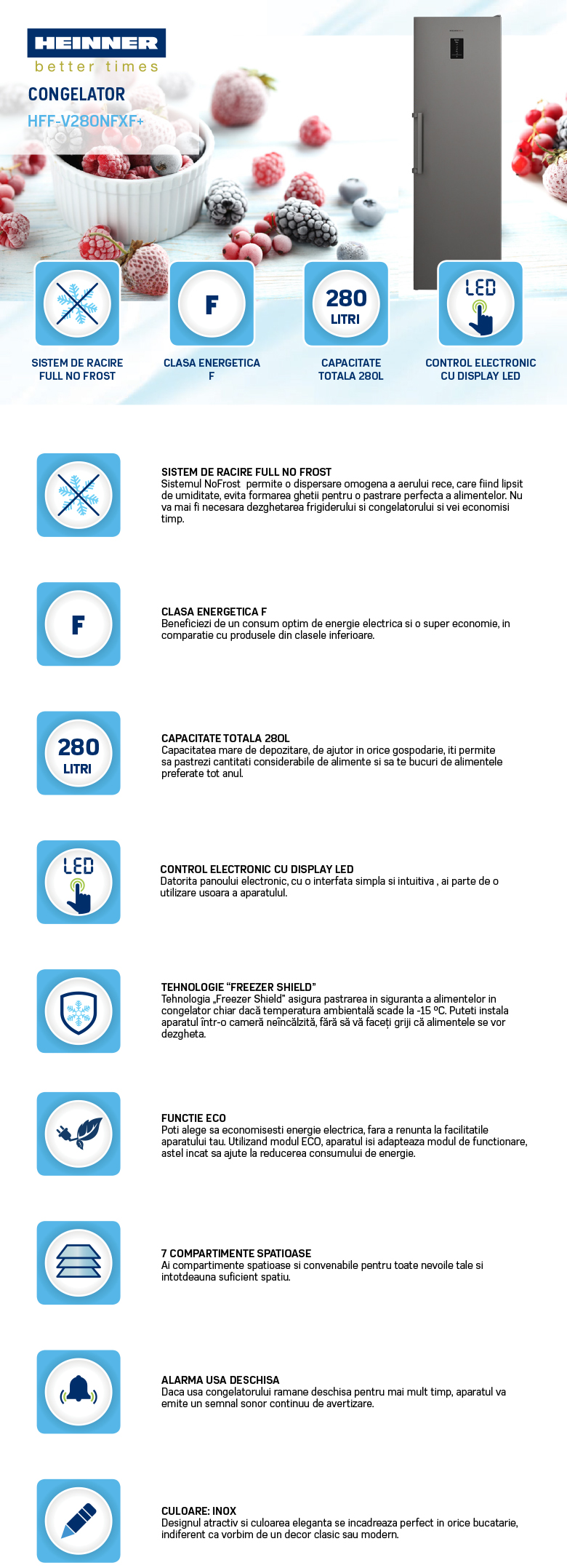 Congelator Heinner HFF-V280NFXF+, Full No Frost, clasa energetica: F, capacitate totala: 280L, display LED, control electronic, tehnologie "Freezer shield" (opereaza la temperaturi scazute de pana la -15°C), functie "Congelare rapida", functie ECO, 7 compartimente congelator, alarma usa deschisa, usa reversibila, tavita cuburi de gheata, capacitate de congelare: 13kg/24h, dimensiuni (WxDxH): 59.5 x 65 x 186 cm, culoare: Aspect inox