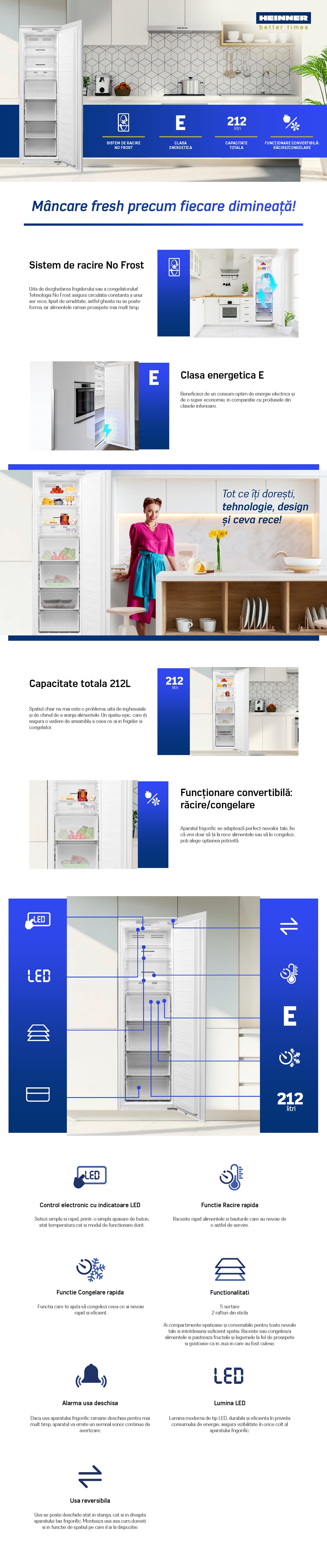 Congelator incorporabil Heinner HFF-BIM212NFCE++, No Frost, Cool & Freeze - functionare convertibila Frigider/Congelator, clasa energetica: E, capacitate totala: 212L, panou de control cu indicatoare LED, control electronic, functie Super racire, functie Super congelare, 7 compartimente congelator: 5 sertare + 2 compartimente cu rafturi din sticla, lumina LED, alarma usa deschisa, usa reversibila, capacitate de congelare: 10kg/24h, dimensiuni (LxAxI): 54 x 55 x 178.5 cm