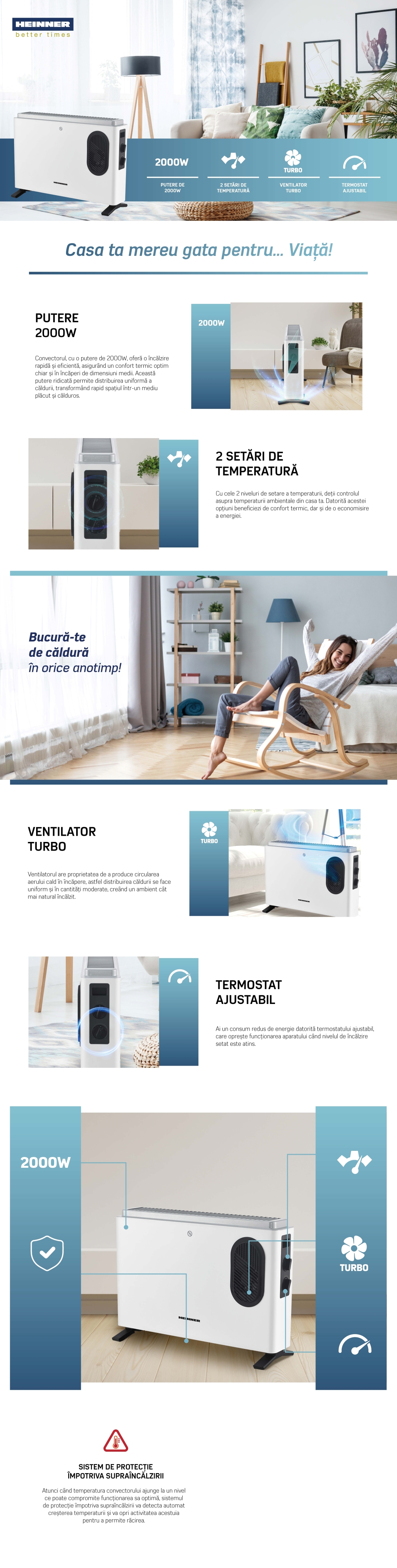 CONVECTOR HEINNER HCVH-MV2000WH, PUTERE 2000W, VENTILATOR TURBO, 2 SETARI DE TEMPERATURA,