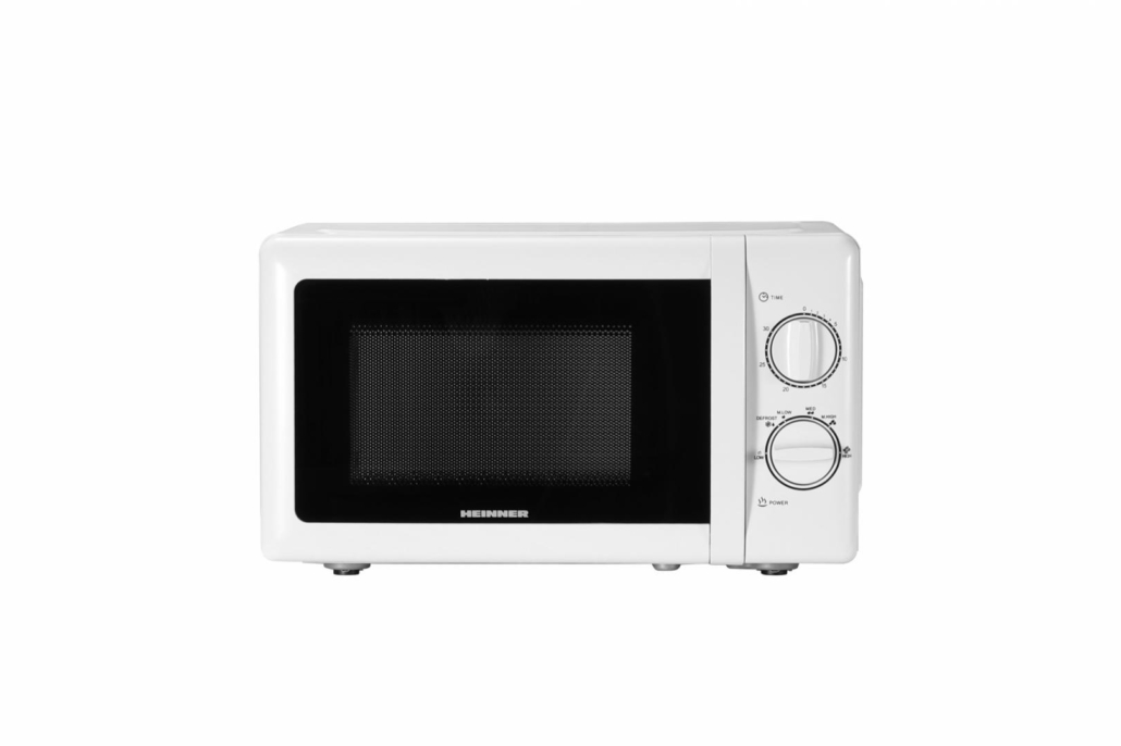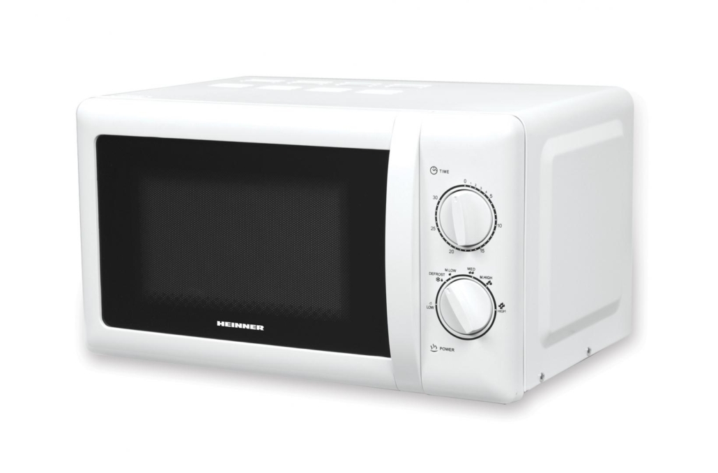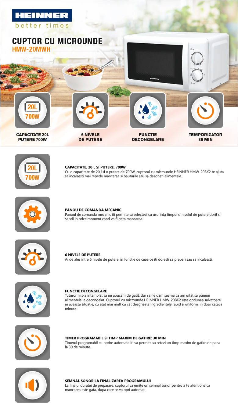Cuptor cu microunde Heinner HMW-20MWH, Capacitate 20L, Control mecanic, Display LED, Putere cuptor 700W, 6 trepte de putere, Timer, Timp maxim de gatire 30 min, Functie decongelare, Semnal sonol la finalizarea programului, Diametru platou rotativ 245mm, Dimensiuni ( LxAxI): 45.1x33.5x25.8 cm, Culoare: Alb