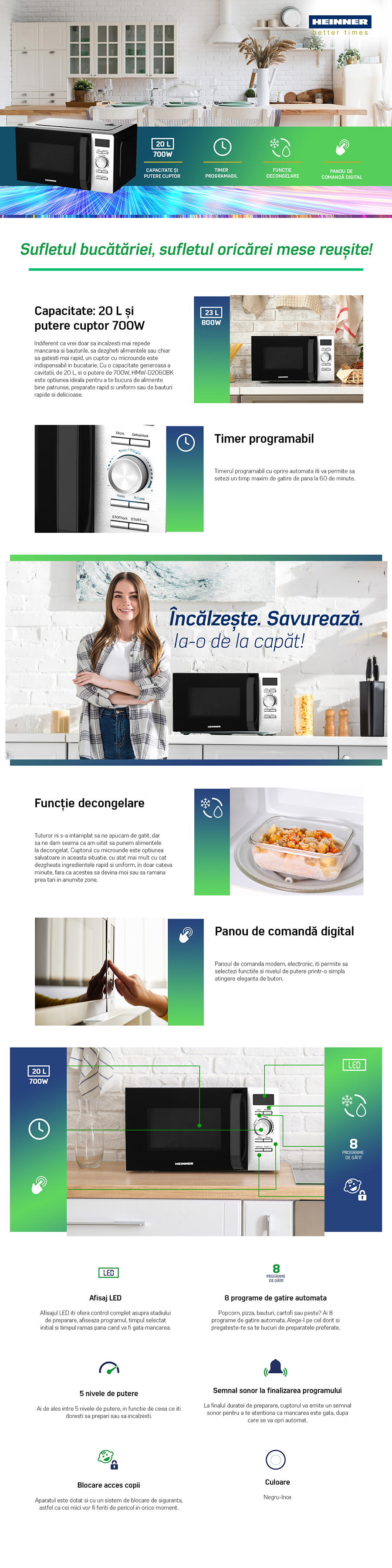 CUPTOR CU MICROUNDE HEINNER HMW-D2060BK, CAPACITATE 20L, CONTROL DIGITAL, DISPLAY LED, PUTERE CUPTOR 700W, 5 TREPTE DE PUTERE, 8 PROGRAME DE GATIRE AUTOMATE, TIMER, TIMP MAXIM DE GATIRE 60 MIN, FUNCTIE DECONGELARE, SEMNAL SONOR LA FINALIZAREA PROGRAMULUI, BLOCARE ACCES COPII, DIAMETRU PLATOU ROTATIV 255MM, DIMENSIUNI ( LXAXI): 45.5X35.3X26.1 CM, CULOARE: NEGRU-INOX