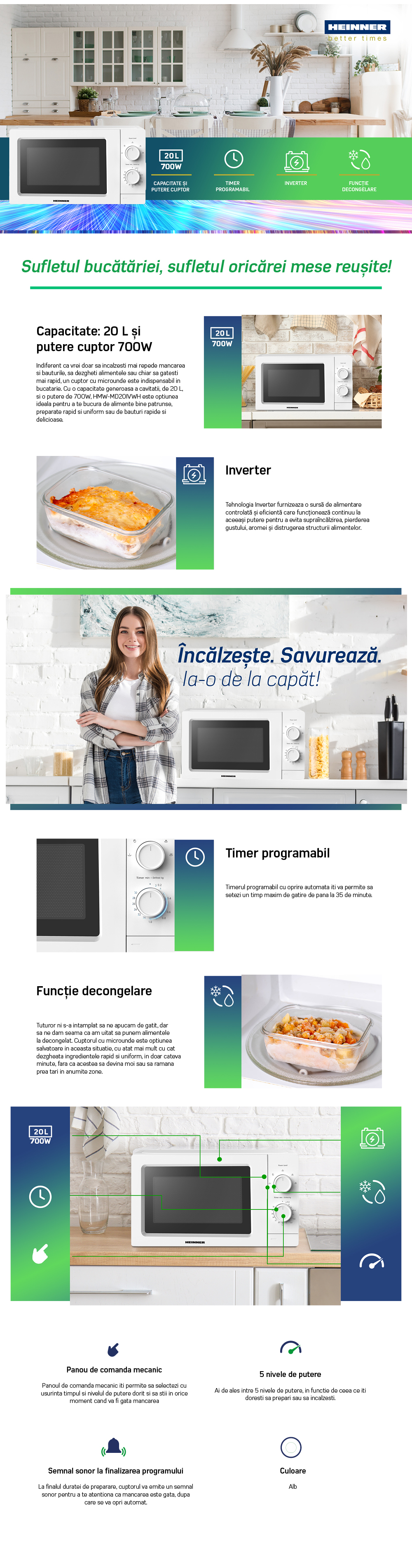 CUPTOR CU MICROUNDE HEINNER HMW-MD20IVWH, CAPACITATE 19L, SOLO INVERTER, CONTROL MECANIC, PUTERE CUPTOR 700W, 5 TREPTE DE PUTERE, TIMER, TIMP MAXIM DE GATIRE 30 MIN, FUNCTIE DECONGELARE, DIAMETRU PLATOU ROTATIV 245MM, DIMENSIUNI ( LXAXI): 43.4X32.9X24.1 CM, CULOARE: ALB