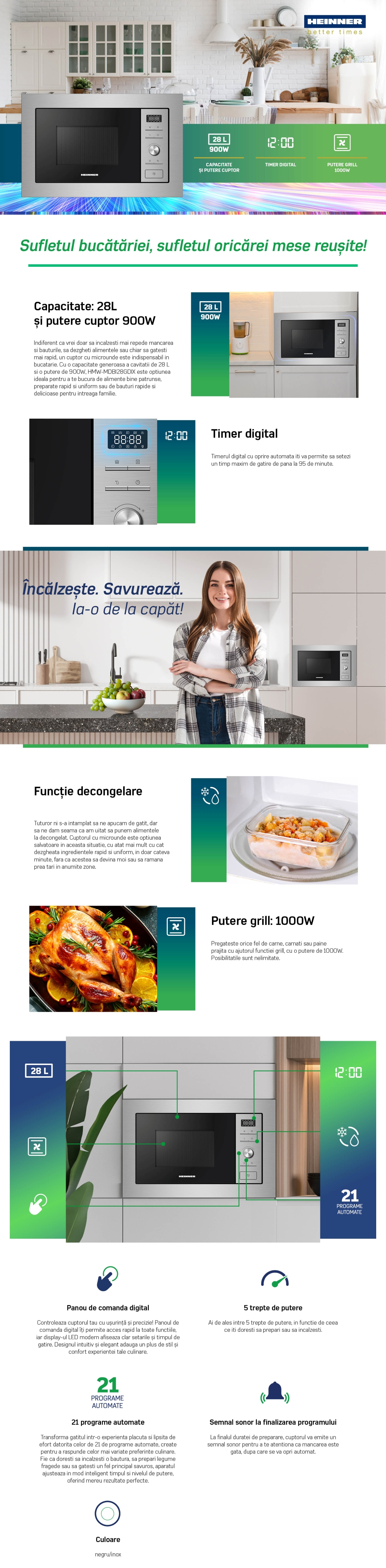 CUPTOR CU MICROUNDE INCORPORABIL HEINNER HMW-MDBI28GDIX, CAPACITATE 28L, CONTROL DIGITAL, AFISAJ DIGITAL, PUTERE CUPTOR: 900W, PUTERE GRILL: 1000W, 5 TREPTE DE PUTERE, 21 PROGRAME AUTOMATE, GATIRE IN MAI MULTE ETAPE, TIMER, TIMP MAXIM DE GATIRE 95 MIN, FUNCTIE DECONGELARE, PROGRAM GATIRE RAPIDA, SEMNAL SONOR LA FINALIZAREA PROGRAMULUI, DIAMETRU PLATOU ROTATIV 288MM, DIMENSIUNI ( LXAXI): 59.4 x 36.9 x 38.2 CM, CULOARE: INOX