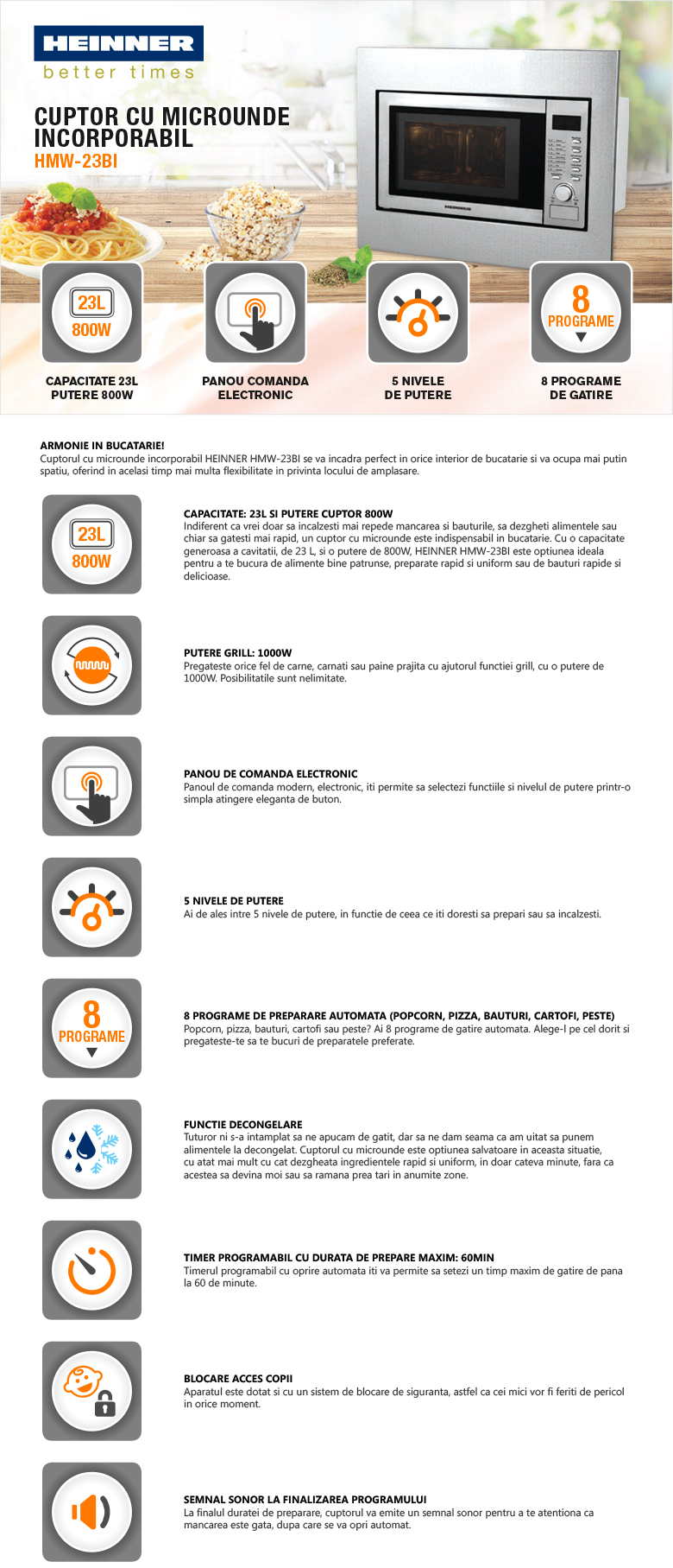 Cuptor cu microunde incorporabil Heinner HMW-23BI, Capacitate 23L, Control digital, Display LED, Putere cuptor 800W, Putere grill 1000W, 5 trepte de putere, Timer, Timp maxim de gatire 60 min, Functie decongelare, Semnal sonor la finalizarea programului, Blocare acces copii, Diametru platou rotativ 270mm, Dimensiuni ( LxAxI): 59.4x35.7x49.5 cm, Culoare: Inox