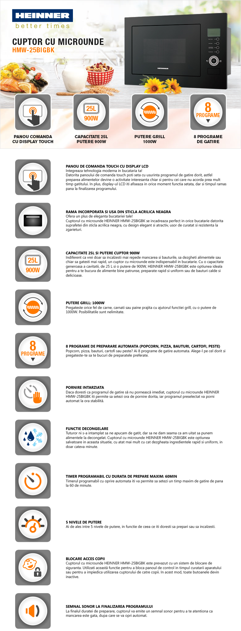 Cuptor cu microunde incorporabil Heinner HMW-25BIGBK, Capacitate 25L, Control touch, Display LCD, Putere cuptor 900W, Putere grill 1000W, 5 trepte de putere, 8 programe de gatire automate, Timer, Timp maxim de gatire 60 min, Functie decongelare, Semnal sonor la finalizarea programului, Blocare acces copii, Diametru platou rotativ 270mm, Dimensiuni ( LxAxI): 59.4x36x39 cm, Culoare: Sticla neagra