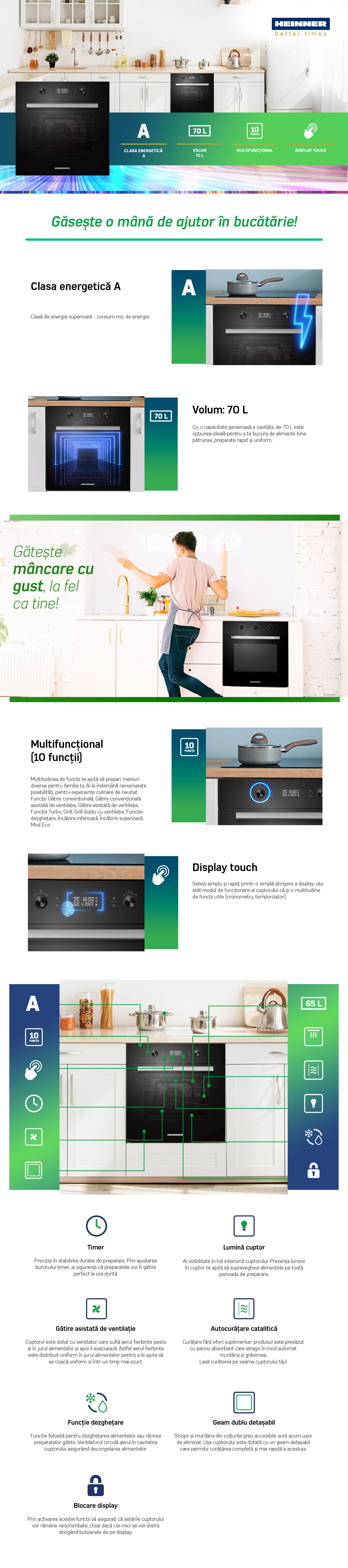CUPTOR INCORPORABIL HEINNER HBO-M709GCDRC-GBK, MULTIFUNCTIONAL, CAPACITATE 70L, 9 FUNCTII, CLASA ENERGETICA A, TIMER DIGITAL, DISPLAY TOUCH+BUTOANE, GRILL, GATIRE ASISTATA DE VENTILATIE, FUNCTIE TURBO, FUNCTIE DEZGHETARE, ILUMINARE, BLOCARE DISPLAY, AUTOCURATARE CATALITICA, GEAM DUBLU DETASABIL, BUTOANE RETRACTABILE, GRILAJ METALIC LATERAL, GRATAR SARMA, TAVA ADANCA, DIMENSIUNI (LXAXH): 59.5X57.5X59.5 CM, CULOARE: STICLA NEAGRA