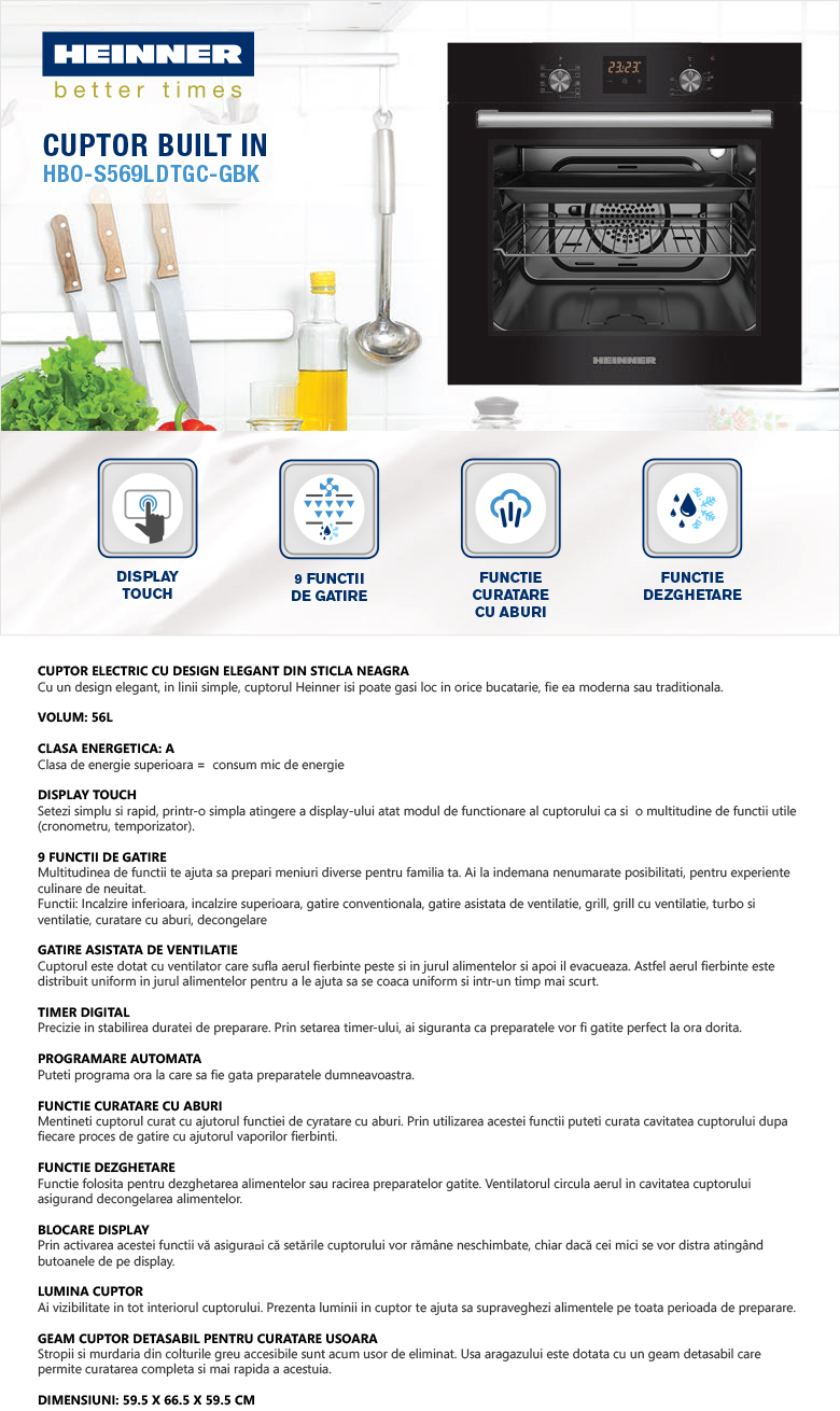Cuptor incorporabil Heinner HBO-S569LDTGC-GBK, Multifunctional, Capacitate 56L, 9 functii, Clasa energetica A, Timer digital, Display touch+butoane, Grill, Gatire asistata de ventilatie, Functie dezghetare, Iluminare, Geam triplu detasabil, Gratar sarma, Tava, Dimensiuni (LxAxH): 59.5x56.5x59.5 cm, Culoare: Sticla Neagra