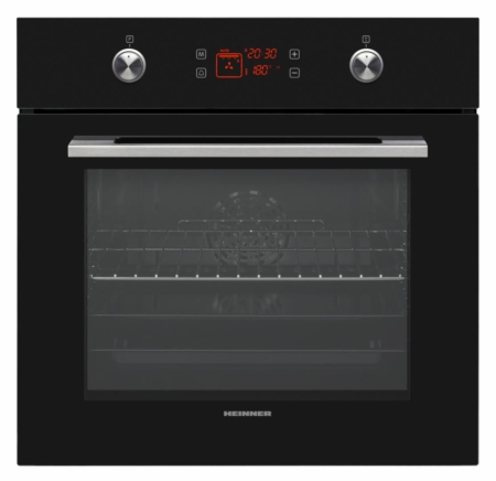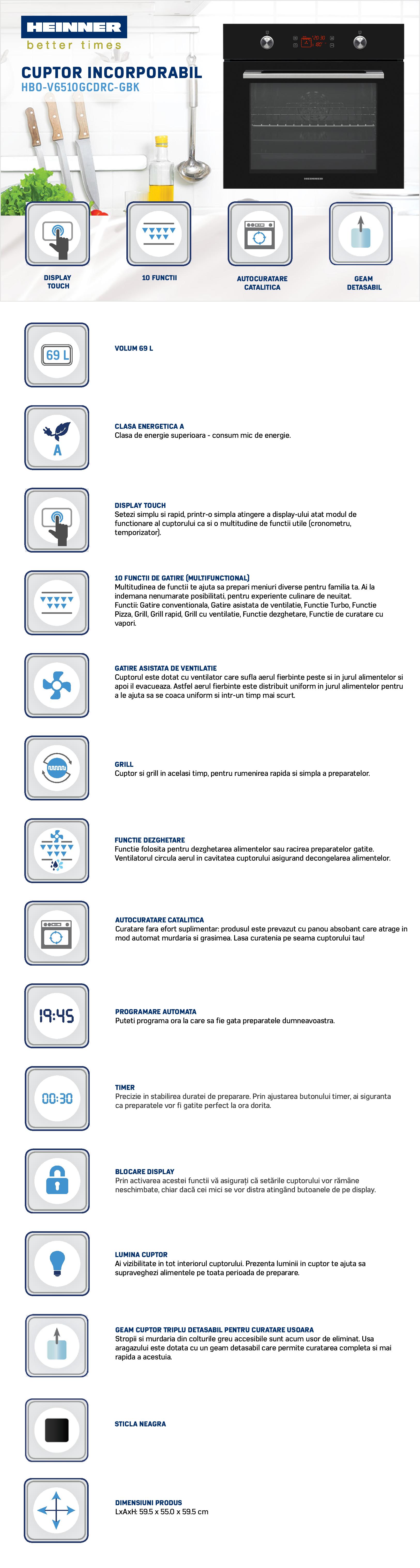Cuptor incorporabil Heinner HBO-V6510GCDRC-GBK, Multifunctional, Capacitate 69L, 10 functii, Clasa energetica A, Timer digital, Display touch+butoane, Grill rapid, Gatire asistata de ventilatie, Functie Turbo, Functie Pizza, Functie dezghetare, Curatare cu vapori, Iluminare, Blocare display, Autocuratare catalitica, Geam triplu detasabil, Butoane retractabile, Grilaj metalic lateral, Gratar sarma, Tava Standard+Adanca, Dimensiuni (LxAxH): 59.5x55.0x59.5 cm, Culoare: Sticla Neagra