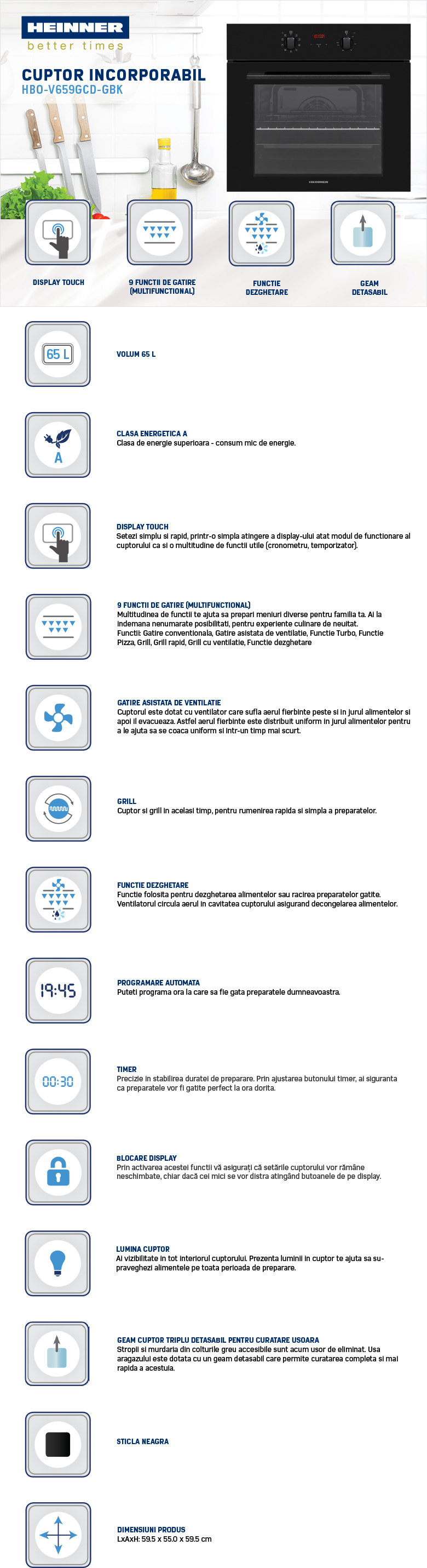 Cuptor incorporabil Heinner HBO-V659GCD-GBK, Multifunctional, Capacitate 65L, 9 functii, Clasa energetica A, Timer digital, Display touch+butoane, Grill, Gatire asistata de ventilatie, Functie Turbo, Functie Pizza, Functie dezghetare, Iluminare, Blocare display, Geam triplu detasabil, Gratar sarma, Tava, Dimensiuni (LxAxH): 59.5x55.0x59.5 cm, Culoare: Sticla neagra