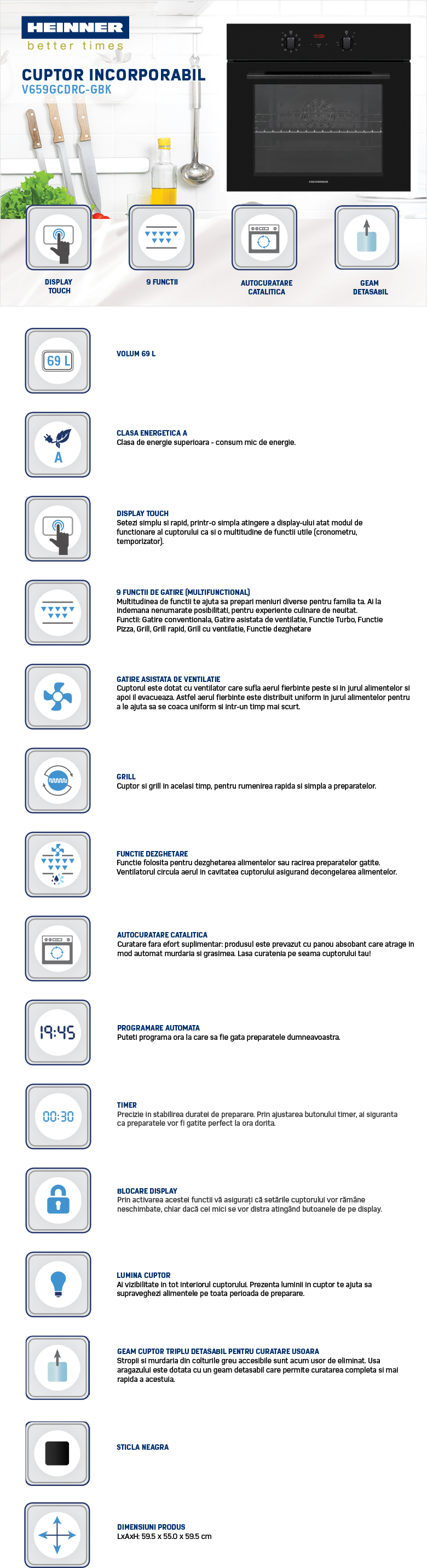 Cuptor incorporabil Heinner HBO-V659GCDRC-GBK, Multifunctional, Capacitate 69L, 9 functii, Clasa energetica A, Timer digital, Display touch+butoane, Grill rapid, Gatire asistata de ventilatie, Functie Turbo, Functie Pizza, Functie dezghetare, Iluminare, Blocare display, Autocuratare catalitica, Geam triplu detasabil, Grilaj metalic lateral, Gratar sarma, Tava, Dimensiuni (LxAxH): 59.5x55.0x59.5 cm, Culoare: Sticla Neagra