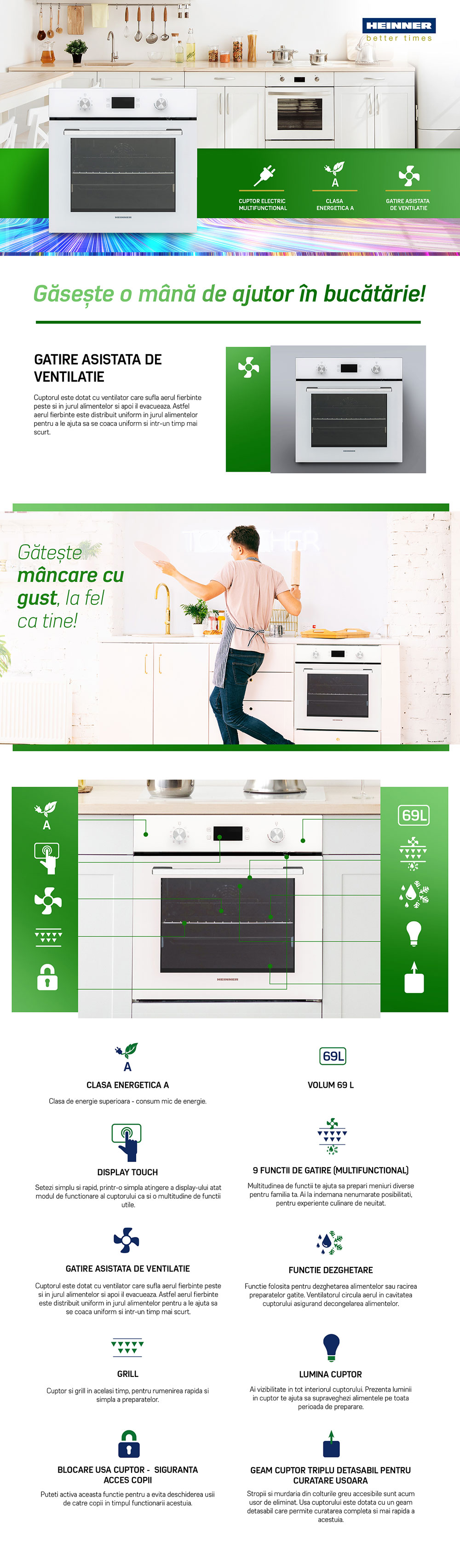 CUPTOR INCORPORABIL HEINNER HBO-V659GCDRC-GWH, MULTIFUNCTIONAL, CAPACITATE 69L, 9 FUNCTII, CLASA ENERGETICA A, TIMER DIGITAL, DISPLAY TOUCH+BUTOANE, GRILL RAPID, GATIRE ASISTATA DE VENTILATIE, FUNCTIE TURBO, FUNCTIE PIZZA, FUNCTIE DEZGHETARE, ILUMINARE, BLOCARE DISPLAY, AUTOCURATARE CATALITICA, GEAM TRIPLU DETASABIL, GRILAJ METALIC LATERAL, SUPORT TAVA TELESCOPIC, GRATAR SARMA, TAVA STANDARD+ADANCA, DIMENSIUNI (LXAXH): 59.5X55.0X59.5 CM, CULOARE: STICLA ALBA