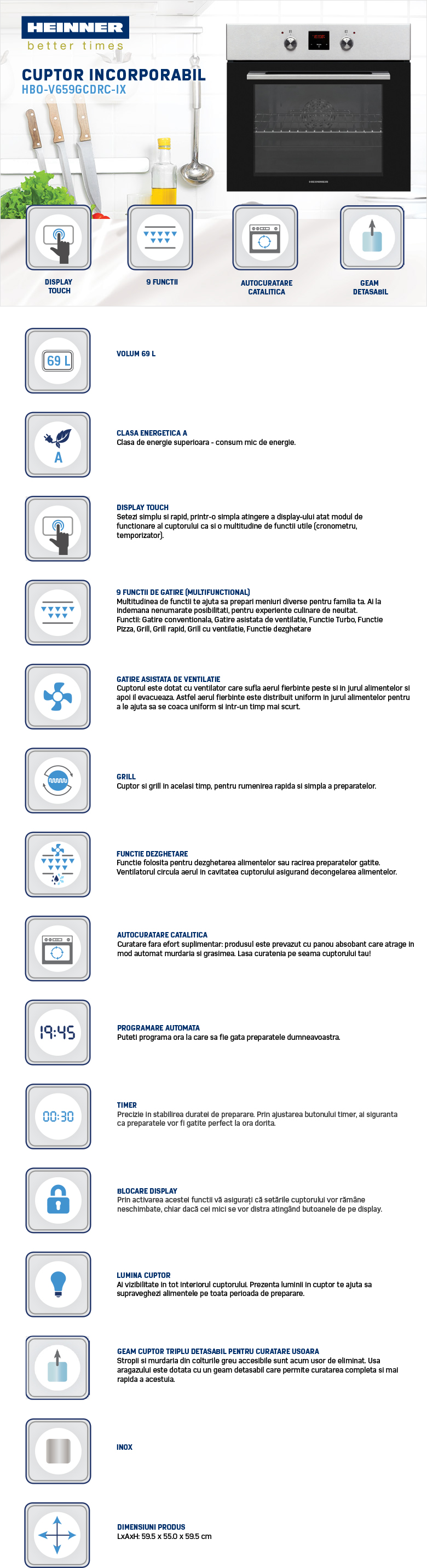 Cuptor incorporabil Heinner HBO-V659GCDRC-IX, Multifunctional, Capacitate 69L, 9 functii, Clasa energetica A, Timer digital, Display touch+butoane, Grill rapid, Gatire asistata de ventilatie, Functie Turbo, Functie Pizza, Functie dezghetare, Iluminare, Blocare display, Autocuratare catalitica, Geam triplu detasabil, Butoane retractabile, Grilaj metalic lateral, Gratar sarma, Tava, Dimensiuni (LxAxH): 59.5x55.0x59.5 cm, Culoare: Inox
