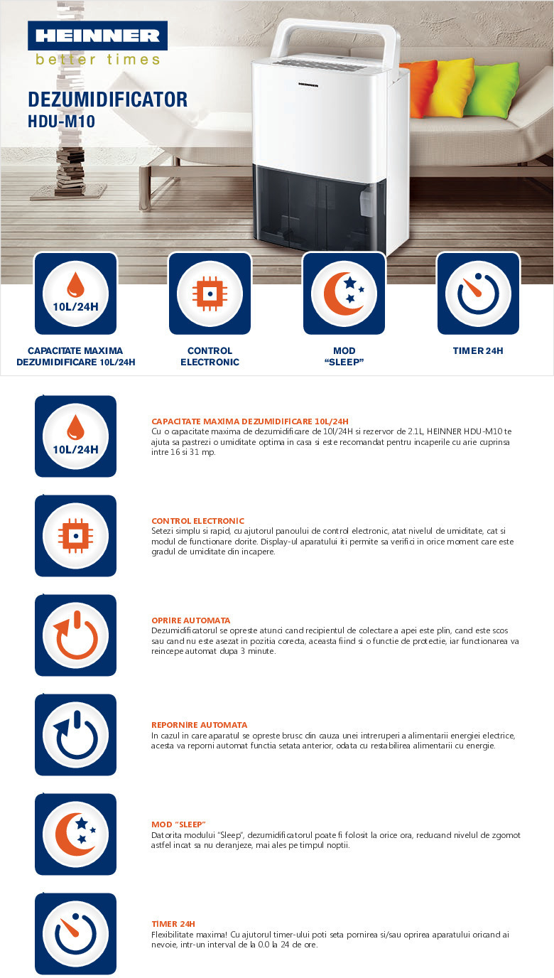Capacitate dezumidificare: 10L/24H, Capacitate rezervor: 2.1L, Arie acoperire 16-31m²,Control Electronic,Display LED, Mod Silent, Mod funcționare continua, Timer 24 ore, Posibilitate setare nivel umiditate, Auto restart, Auto dezghetare, Temperatura ambientala 5-32°C, Maner