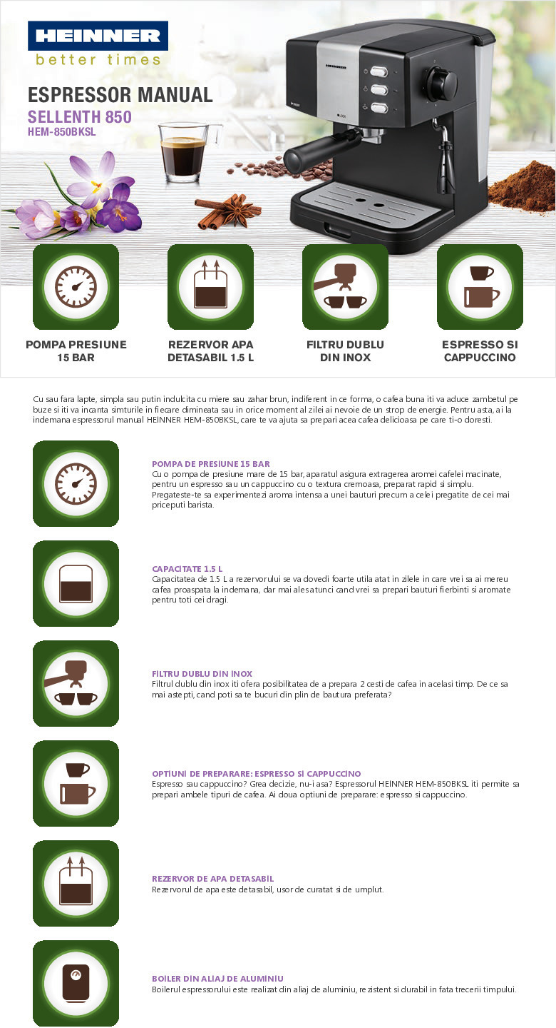 Espresor Heinner HEM-850BKSL, pompa presiune 15 bar, filtrul dublu din inox, preparare espresso si spuma de lapte, capacitate rezervor detasabil 1.5L, tavita scurgere detasabila, protectie supraincalzire, valva de siguranta presiune, putere 850W, negru