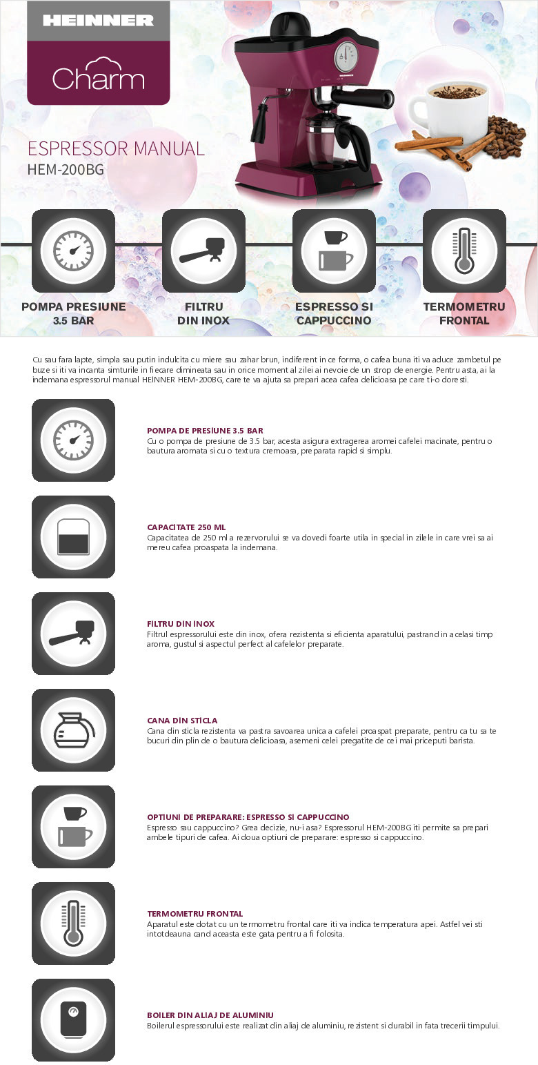 Espressor Heinner CHARM HEM-200BG, putere: 800 W, capacitate rezervor detasabil transparent : 250 ml, presiune pompa: 3.5 bar, termometru frontal pentru apa, optiuni preparare: espresso si cappuccino, tavita de scurgere detasabila, boiler din aliaj de aluminiu, filtru din inox pentru 4 cesti de cafea, culoare: visiniu
