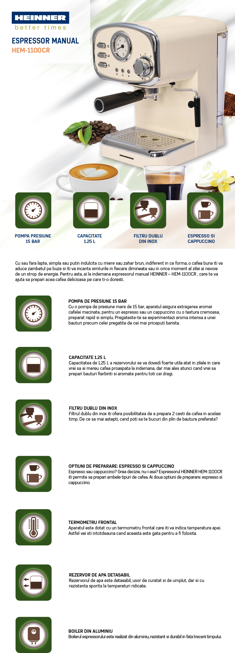 Espresor Heinner HEM-1100CR, presiune: 15 bar, boiler aluminiu turnat, rezervor detasabil: 1.25L, filtru dublu din inox pentru 2 cesti, termometru inclus, tavita pentru apa detasabila, optiuni pentru espresso si cappuccino, buton pentru ajustarea nivelului de spuma