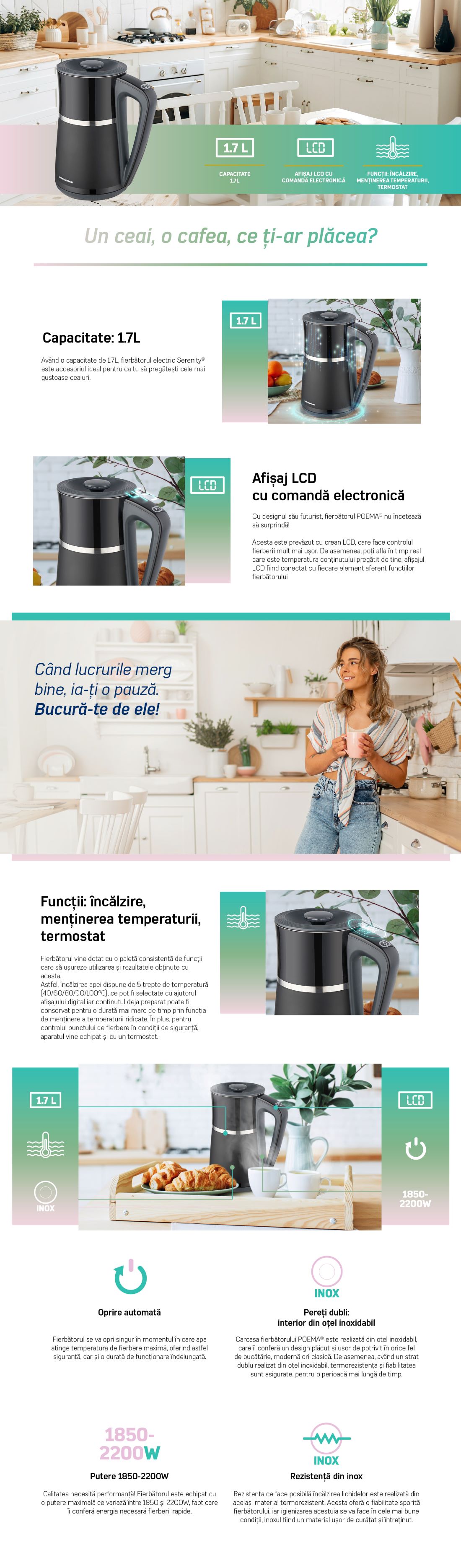 FIERBATOR ELECTRIC DIGITAL HEINNER HEK-D22002WBK, 1850-2200W, 1.7L, PERETI DUBLI: CAVITATE INOX, DISPLAY LCD CU CONTROL ELECTRONIC, 5 SETARI DE TEMPERATURA: 40/60/80/90/100 GRADE, FUNCTII: INCALZIRE, MENTINERE CALD, TERMOSTAT, INFO TEMPERATURA PE DISPLAY, OPRIRE AUTOMATA, PROTECTIE IMPOTRIVA FUNCTIONARII FARA APA, ELEMENT INCALZIRE INOX, NEGRU