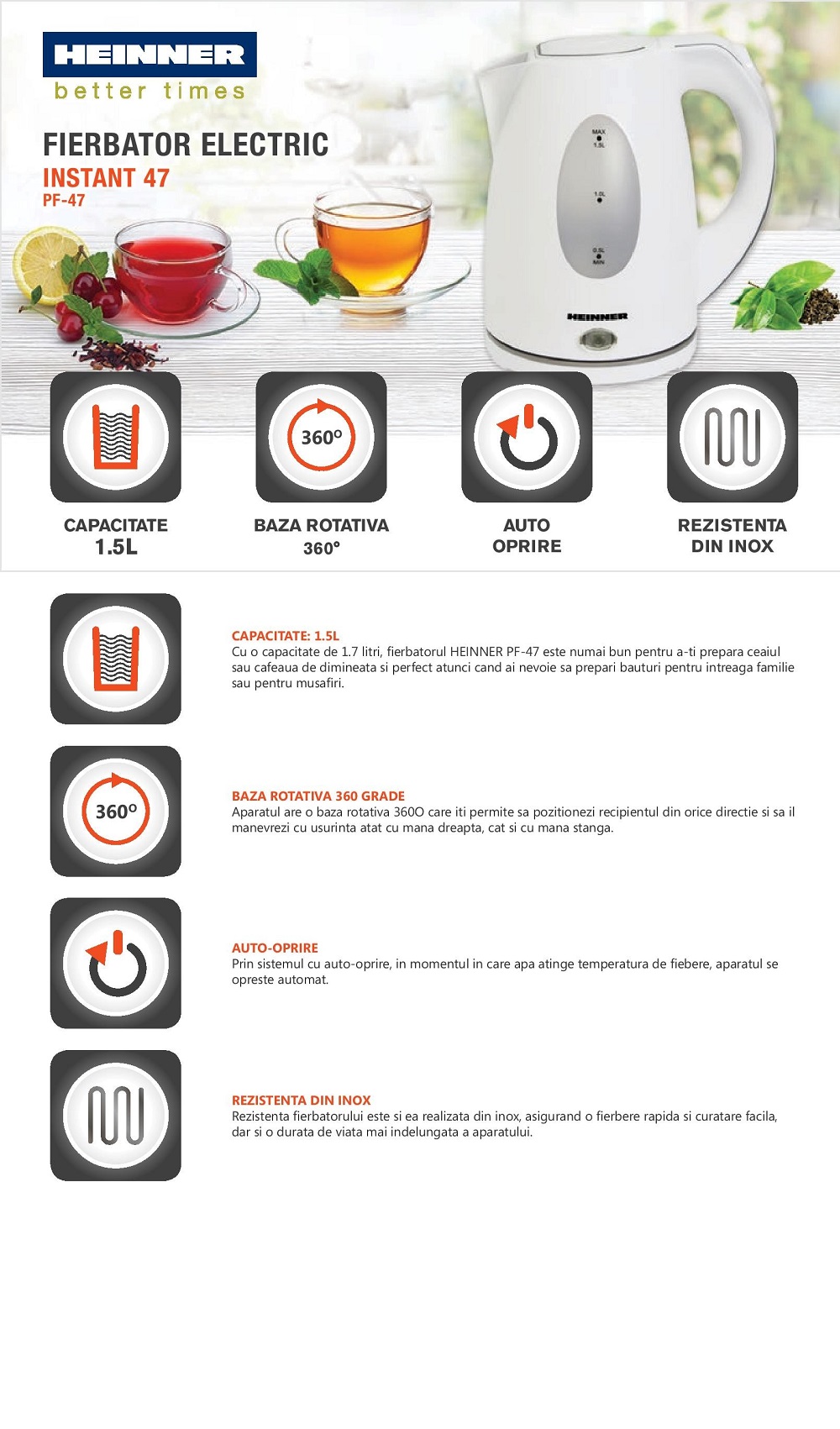 Fierbator Heinner Instant-47, Plastic, Filtru detasabil si lavabil, Baza rotativa 360 grade, Auto-oprire, Rezistenta acoperita, Buton ON/OFF, Capacitate: 1.5L, Putere: 2200W