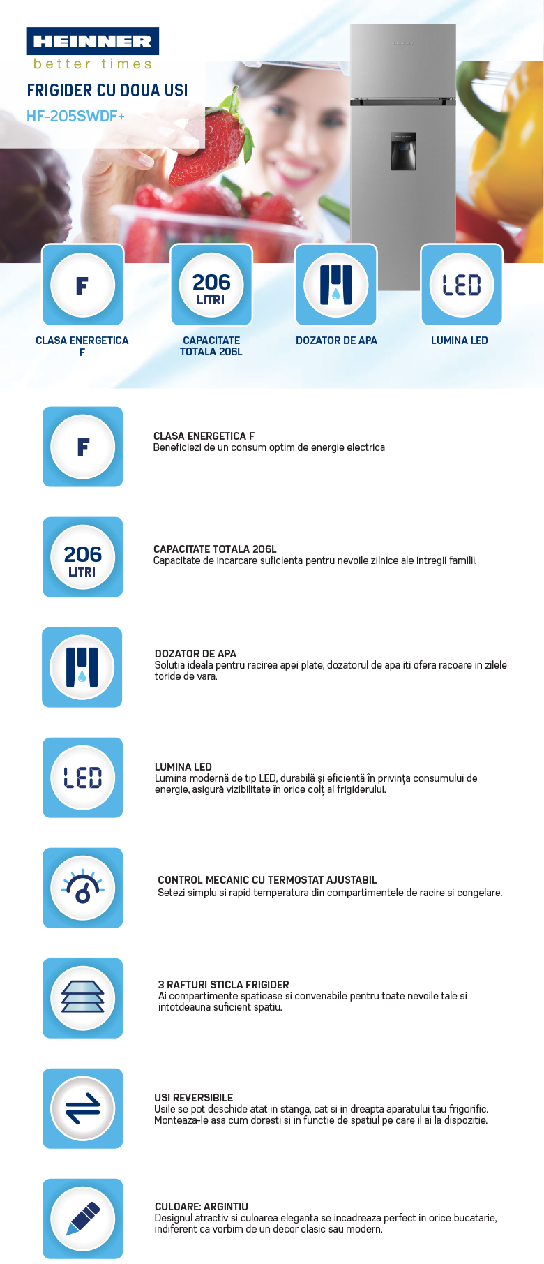 Frigider cu doua usi Heinner HF-205SWDF+, clasa energetica: F, dozator de apa, capacitate totala: 206L, capacitate frigider: 165L, capacitate congelator: 41L, control mecanic cu termostat reglabil, lumina LED, 3 rafturi din sticla, compartiment pentru fructe si legume, usi reversibile, suport oua, tavita cuburi de gheata, capacitate congelare: 2kg/24h, dimensiuni (WxDxH): 55 x 54.2 × 143.4 cm, culoare: argintiu cu maner elegant negru