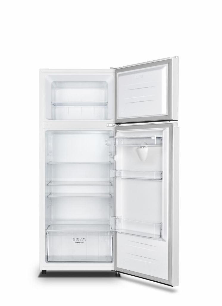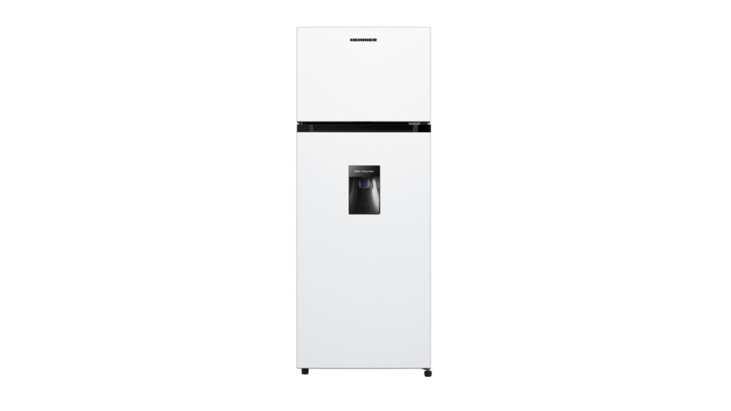 Frigider cu doua usi Heinner HF-205WDF+, clasa energetica: F, dozator de apa, capacitate totala: 206L, capacitate frigider: 165L, capacitate congelator: 41L, control mecanic cu termostat reglabil, lumina LED, 3 rafturi din sticla, compartiment pentru fructe si legume, usi reversibile, suport oua, tavita cuburi de gheata, capacitate congelare: 2kg/24h, dimensiuni (WxDxH): 55 x 54.2 × 143.4 cm, culoare: alb cu maner elegant negru