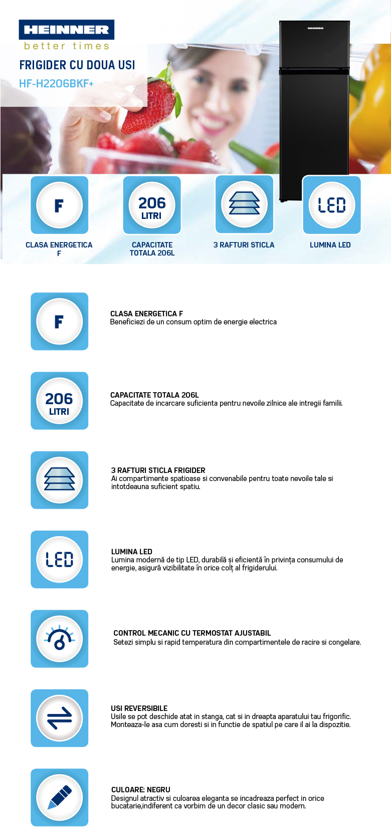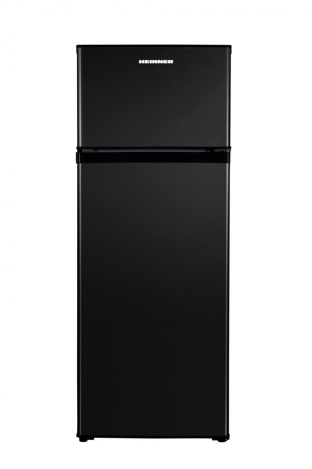 Frigider cu doua usi Heinner HF-H2206BKF+, clasa energetica: F, capacitate totala: 206L, capacitate frigider: 169L, capacitate congelator: 37L, control mecanic cu termostat ajustabil, lumina LED, 3 rafturi sticla frigider, compartiment pentru fructe si legume, usi reversibile, suport oua, capacitate congelare: 2.4kg/24h, dimensiuni (WxDxH): 54.5 x 55.5 x 143 cm, culoare: Negru