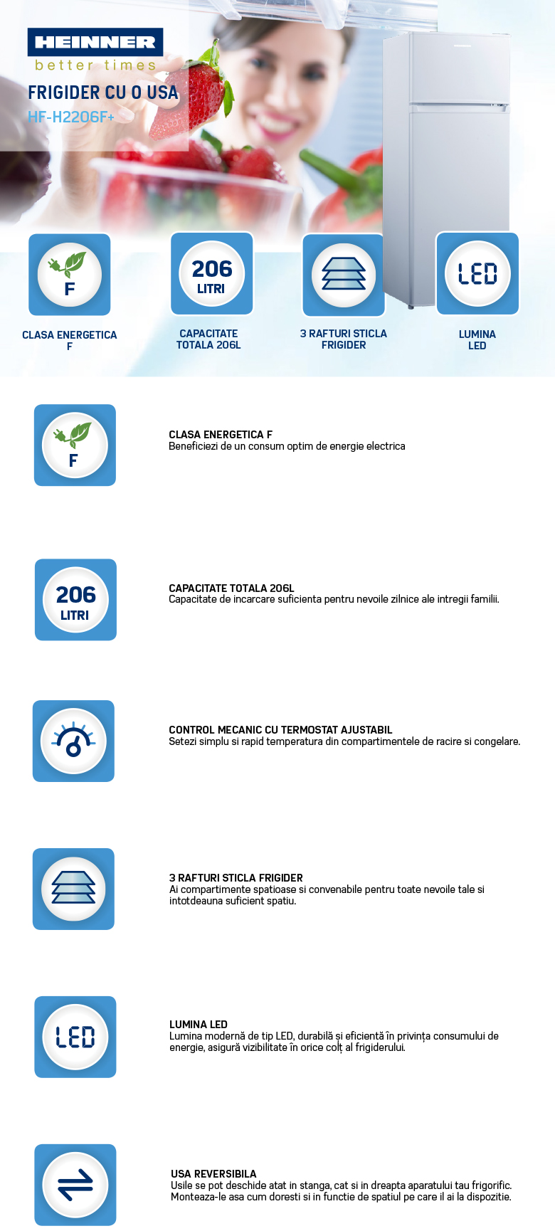 Frigider cu doua usi Heinner HF-H2206F+, clasa energetica: F, capacitate totala: 206L, capacitate frigider: 169L, capacitate congelator: 37L, control mecanic cu termostat ajustabil, lumina LED, 3 rafturi sticla frigider, compartiment pentru fructe si legume, usi reversibile, suport oua, capacitate congelare: 2.4kg/24h, dimensiuni (WxDxH): 54.5 x 55.5 x 143 cm, culoare: Alb