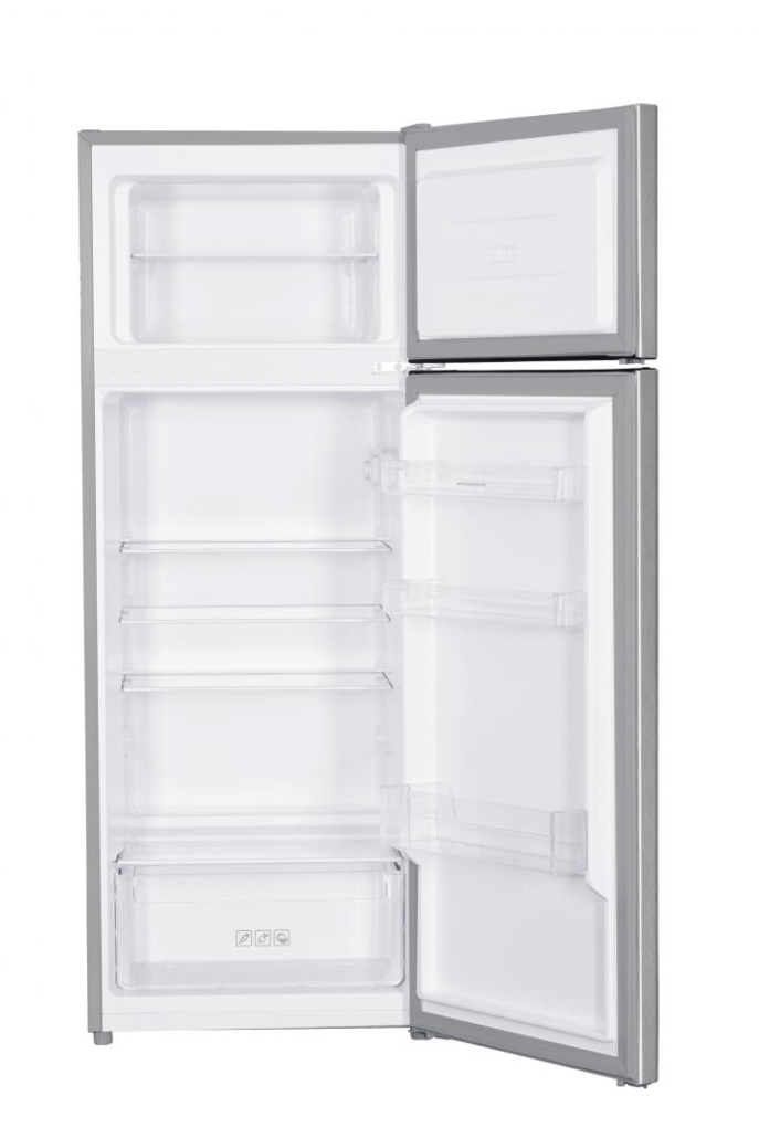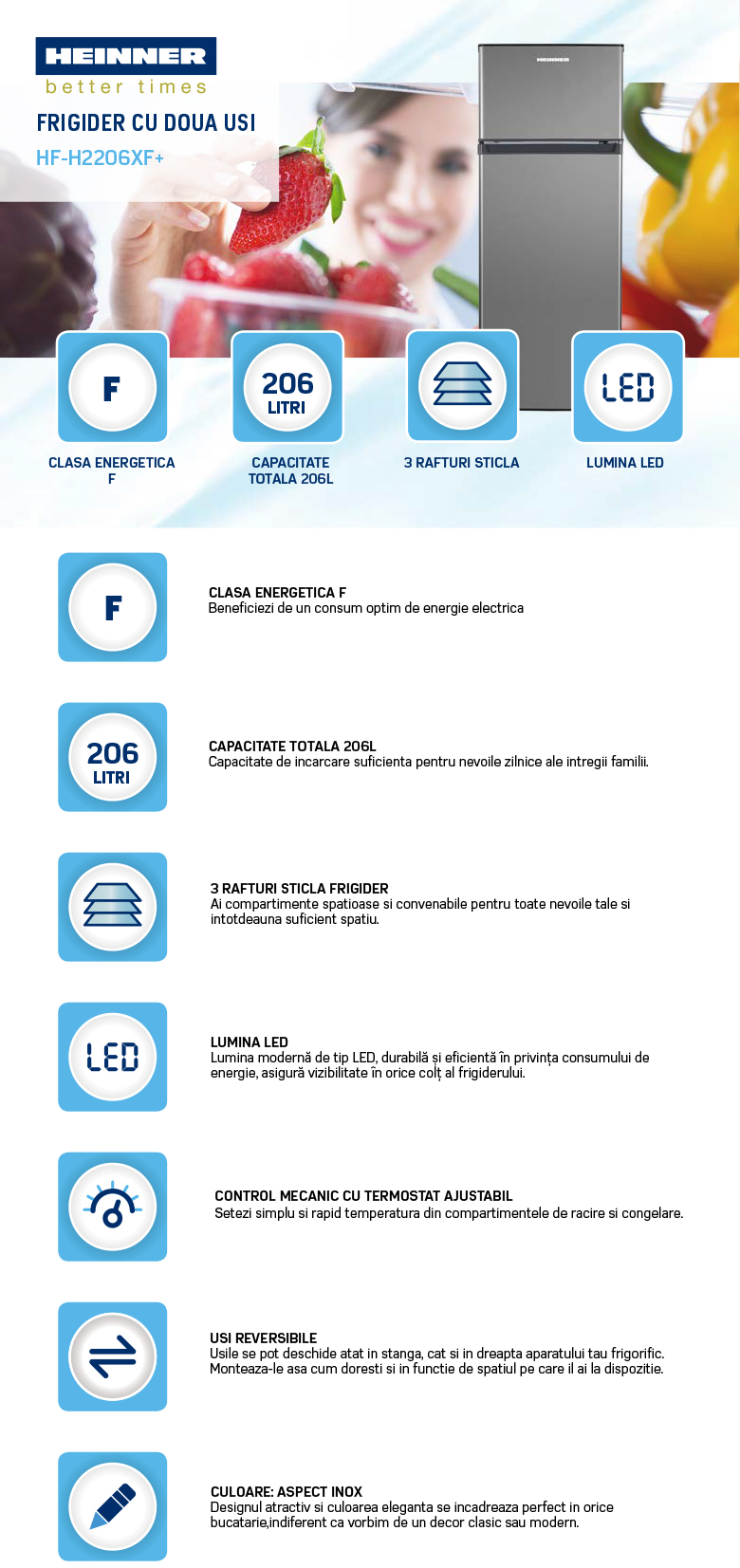 Frigider cu doua usi Heinner HF-H2206XF+, clasa energetica: F, capacitate totala: 206L, capacitate frigider: 169L, capacitate congelator: 37L, control mecanic cu termostat ajustabil, lumina LED, 3 rafturi sticla frigider, compartiment pentru fructe si legume, usi reversibile, suport oua, capacitate congelare: 2.4kg/24h, dimensiuni (WxDxH): 54.5 x 55.5 x 143 cm, culoare: Aspect inox