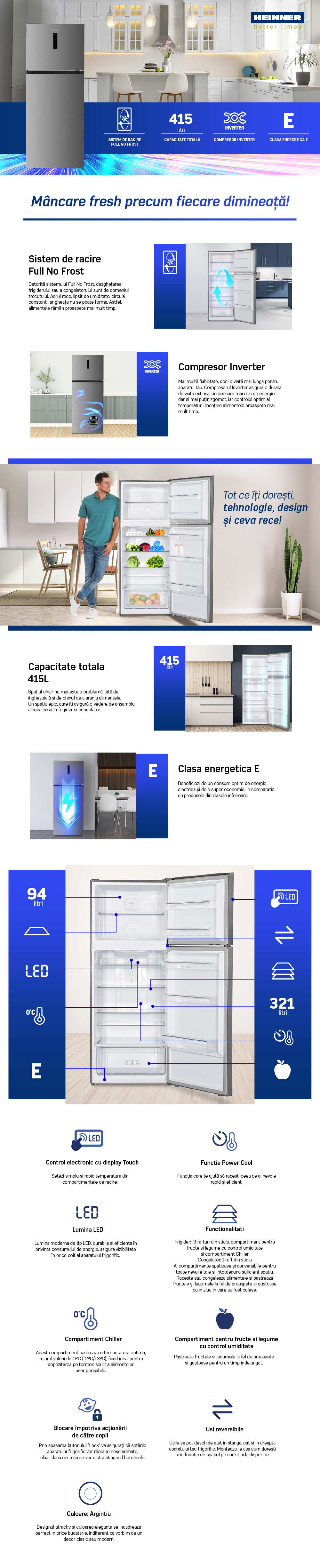 Frigider Heinner HF-HM415NFSE++, Full No Frost, compresor Inverter, clasa energetica: E, capacitate totala: 415 L, capacitate frigider: 321 L, capacitate congelator: 94 L, control electronic cu display Touch, lumina LED, functie Power cool, blocare acces copii, 3 rafturi sticla frigider, compartiment fructe si legume cu control nivel umiditate, 1 raft sticla congelator, usi reversibile, suport oua, tavita cuburi gheata, capacitate congelare: 4.4kg/24h, dimensiuni (WxDxH): 70 x 68 x 178 cm, culoare: Argintiu