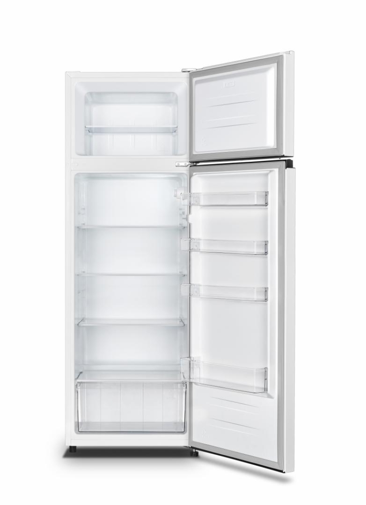 Frigider cu 2 usi Heinner HF-HS243E++, clasa energetica: E, capacitate totala: 243L, capacitate frigider: 202L, capacitate congelator: 41L, control mecanic cu termostat ajustabil, lumina LED, 3 rafturi sticla frigider, compartiment pentru fructe si legume, 3 compartimente congelator, usi reversibile, suport oua, tavita cuburi gheata, capacitate congelare: 2 kg/24h, dimensiuni (WxDxH): 55 x 54.2 x 161 cm, culoare: Alb cu maner negru
