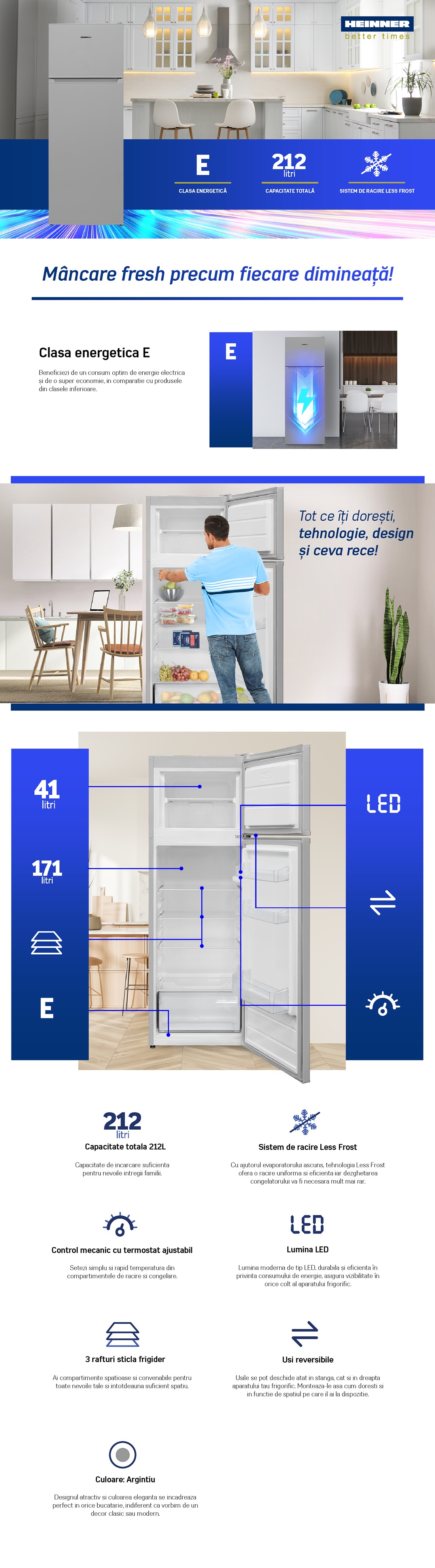 Frigider cu 2 usi Heinner HF-V212SE++, clasa energetica: E, capacitate totala: 212L, capacitate frigider: 171L, capacitate congelator: 41L, control mecanic cu termostat reglabil, lumina LED, 3 rafturi din sticla, compartiment pentru fructe si legume, suport oua, recipient cuburi de gheata, usi reversibile, capacitate congelare: 2.6kg/24h, dimensiuni (WxDxH): 54 x 57 x 145 cm, culoare: Argintiu