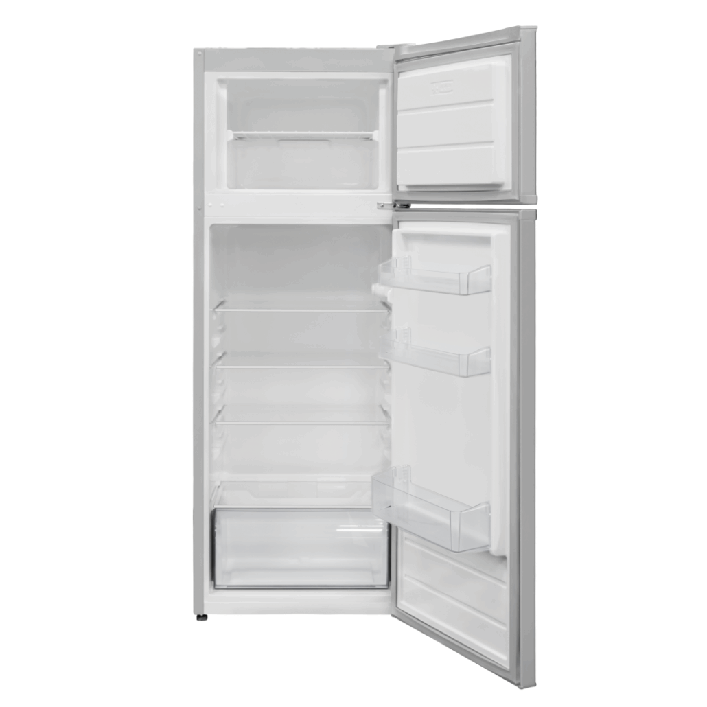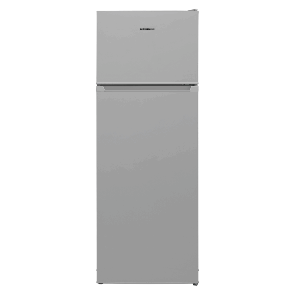 Frigider cu 2 usi Heinner HF-V212SE++, clasa energetica: E, capacitate totala: 212L, capacitate frigider: 171L, capacitate congelator: 41L, control mecanic cu termostat reglabil, lumina LED, 3 rafturi din sticla, compartiment pentru fructe si legume, suport oua, recipient cuburi de gheata, usi reversibile, capacitate congelare: 2.6kg/24h, dimensiuni (WxDxH): 54 x 57 x 145 cm, culoare: Argintiu