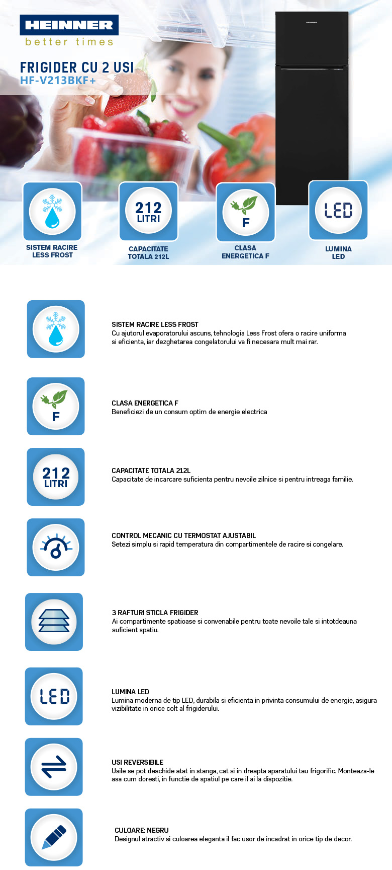 Frigider cu doua usi Heinner HF-V213BKF+, clasa energetica: F, Sistem de racire Less Frost, capacitate totala: 212L, capacitate frigider: 171L, capacitate congelator: 41L, control mecanic cu termostat reglabil, lumina LED, 3 rafturi din sticla, compartiment pentru fructe si legume, suport oua, recipient cuburi de gheata, usi reversibile, suport de oua, tavita cuburi de gheata, capacitate congelare: 2.6kg/24h, dimensiuni (WxDxH): 54 x 57 x 144 cm, culoare: Negru.