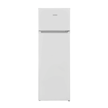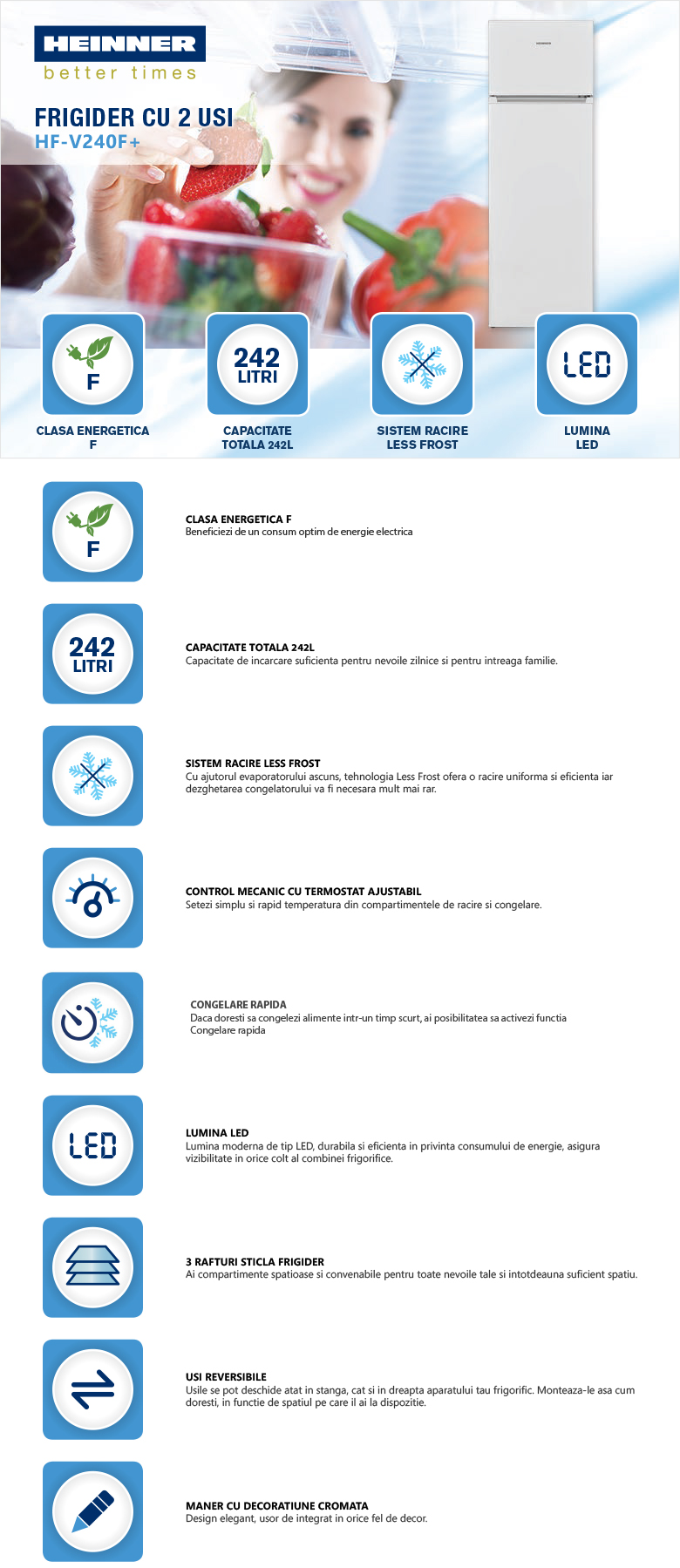 Frigider cu doua usi Heinner HF-V240F+, clasa energetica: F, sistem racire Less Frost, capacitate totala: 242L, capacitate frigider: 201L, capacitate congelator: 41L, control mecanic cu termostat ajustabil, lumina LED, 3 rafturi sticla frigider, compartiment pentru fructe si legume, usi reversibile, suport oua, tavita cuburi gheata, capacitate congelare: 2.6kg/24h, dimensiuni (WxDxH): 54 x 57 x 160 cm, maner cu decoratiune cromata, culoare: Alb
