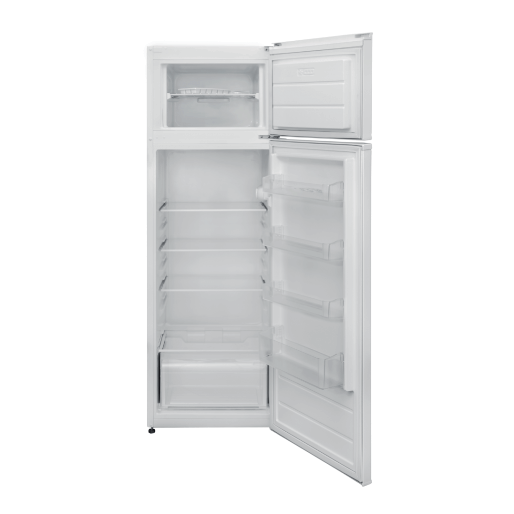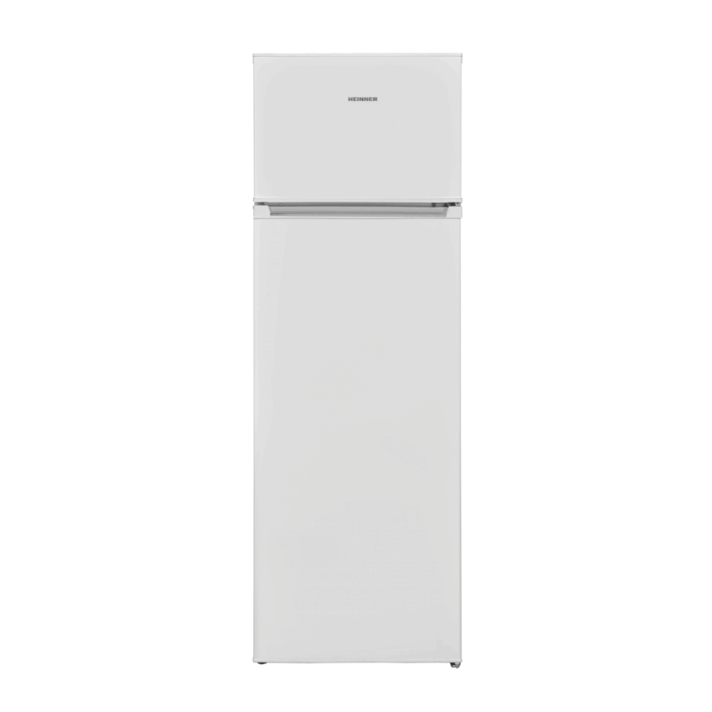 Frigider cu doua usi Heinner HF-V240F+, clasa energetica: F, sistem racire Less Frost, capacitate totala: 242L, capacitate frigider: 201L, capacitate congelator: 41L, control mecanic cu termostat ajustabil, lumina LED, 3 rafturi sticla frigider, compartiment pentru fructe si legume, usi reversibile, suport oua, tavita cuburi gheata, capacitate congelare: 2.6kg/24h, dimensiuni (WxDxH): 54 x 57 x 160 cm, maner cu decoratiune cromata, culoare: Alb