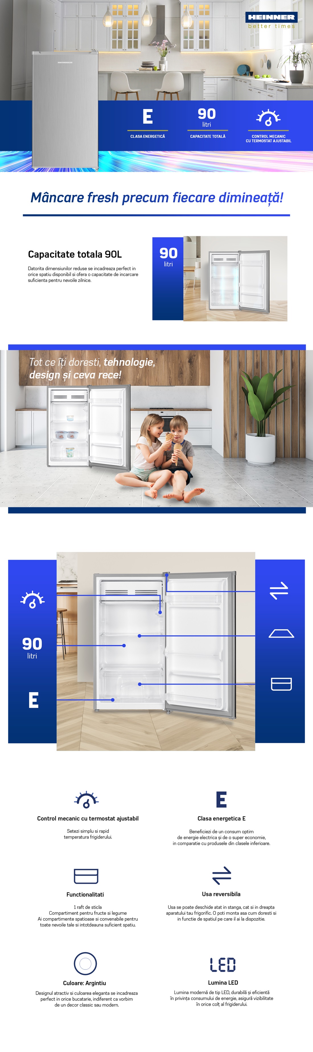 Frigider Heinner HF-HM90SE++, clasa energetica E, capacitate totala: 90 L, lumina LED, 1 r