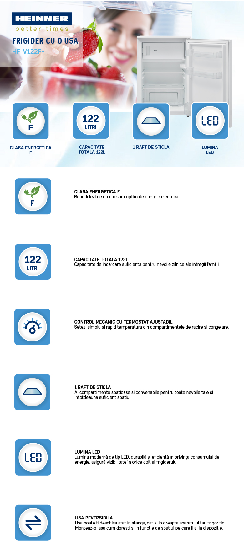 Frigider cu o usa Heinner HF-V122F+, clasa energetica: F, capacitate totala: 122L, capacitate frigider: 125L, capacitate congelator: 17L, control mecanic cu termostat reglabil, lumina LED, functie congelare rapida, raft din sticla, compartiment pentru fructe si legume, usa reversibila, capacitate congelare: 2.6kg/24h, dimensiuni produs (WxDxH): 54 x 59.5 x 83.8 cm, culoare: alb
