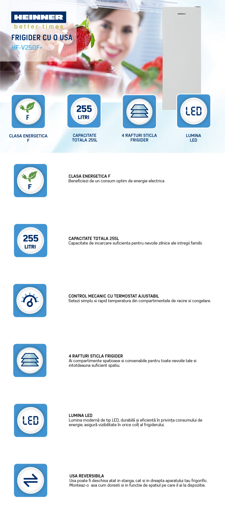 Frigider Heinner HF-V250F+, clasa energetica: F, capacitate totala: 255L, control mecanic cu termostat ajustabil, lumina LED, dezghetare automata, 4 rafturi din sticla, compartiment pentru fructe si legume, suport oua, usa reversibila, dimensiuni: 54 x 59.