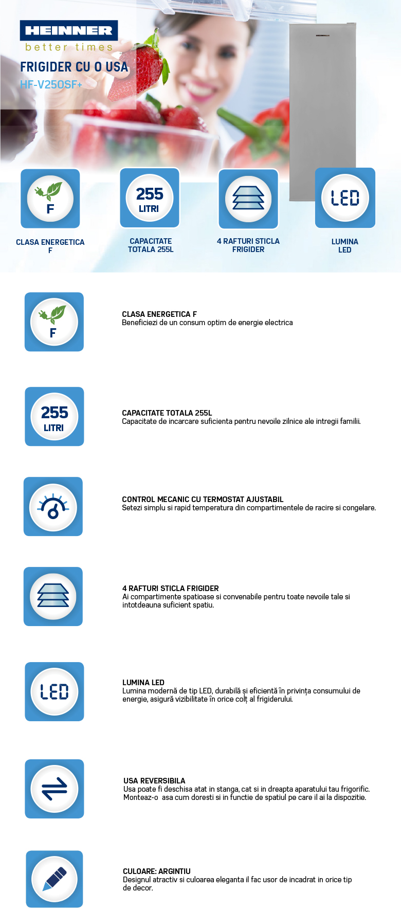 Frigider Heinner HF-V250SF+, clasa energetica: F, capacitate totala: 255L, control mecanic cu termostat ajustabil, lumina LED, dezghetare automata, 4 rafturi din sticla, compartiment pentru fructe si legume, suport oua, usa reversibila, dimensiuni: 54 x 59.5 x 144 cm, culoare: argintiu